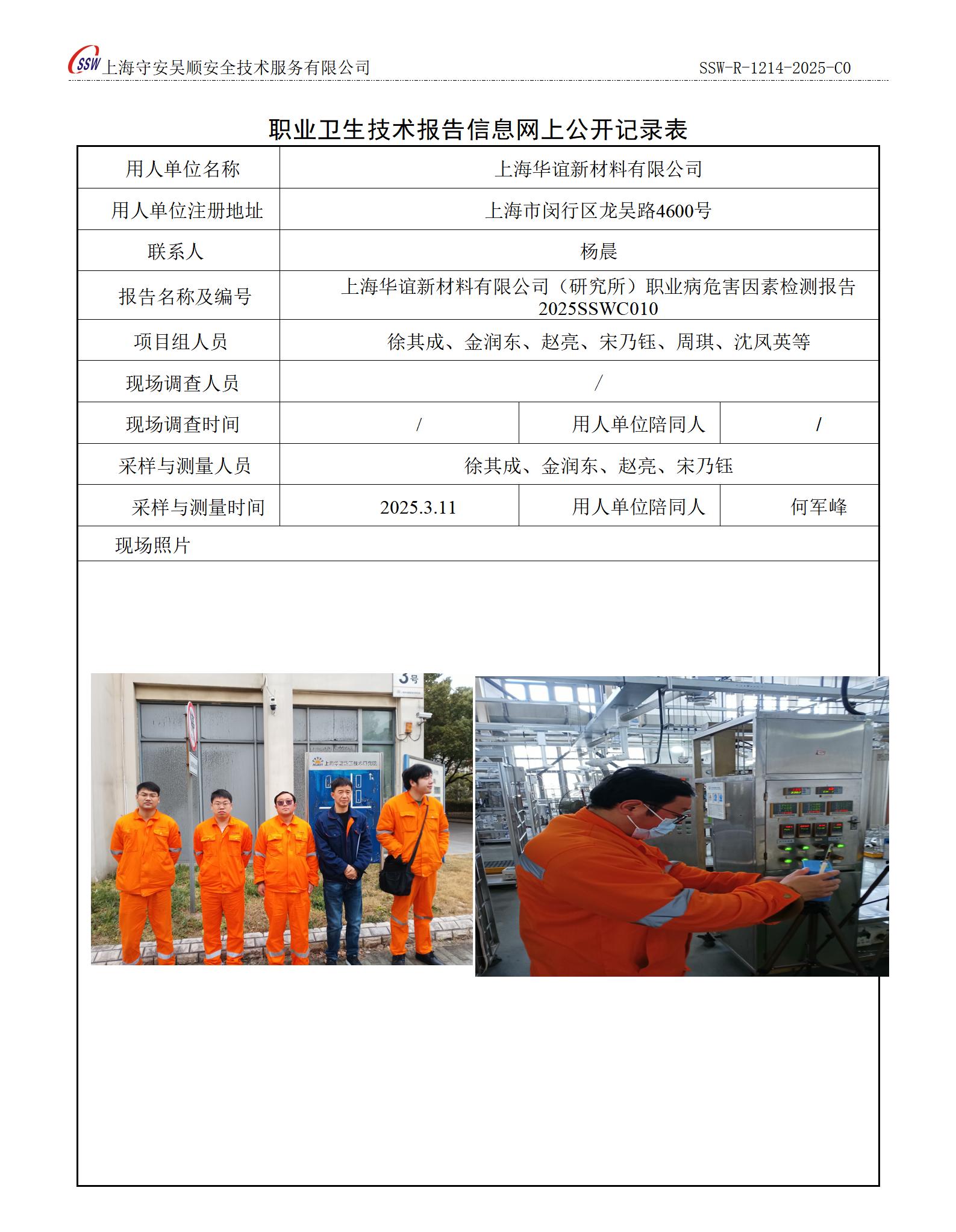 上海华谊新材料有限公司(研究所)职业病危害因素检测
