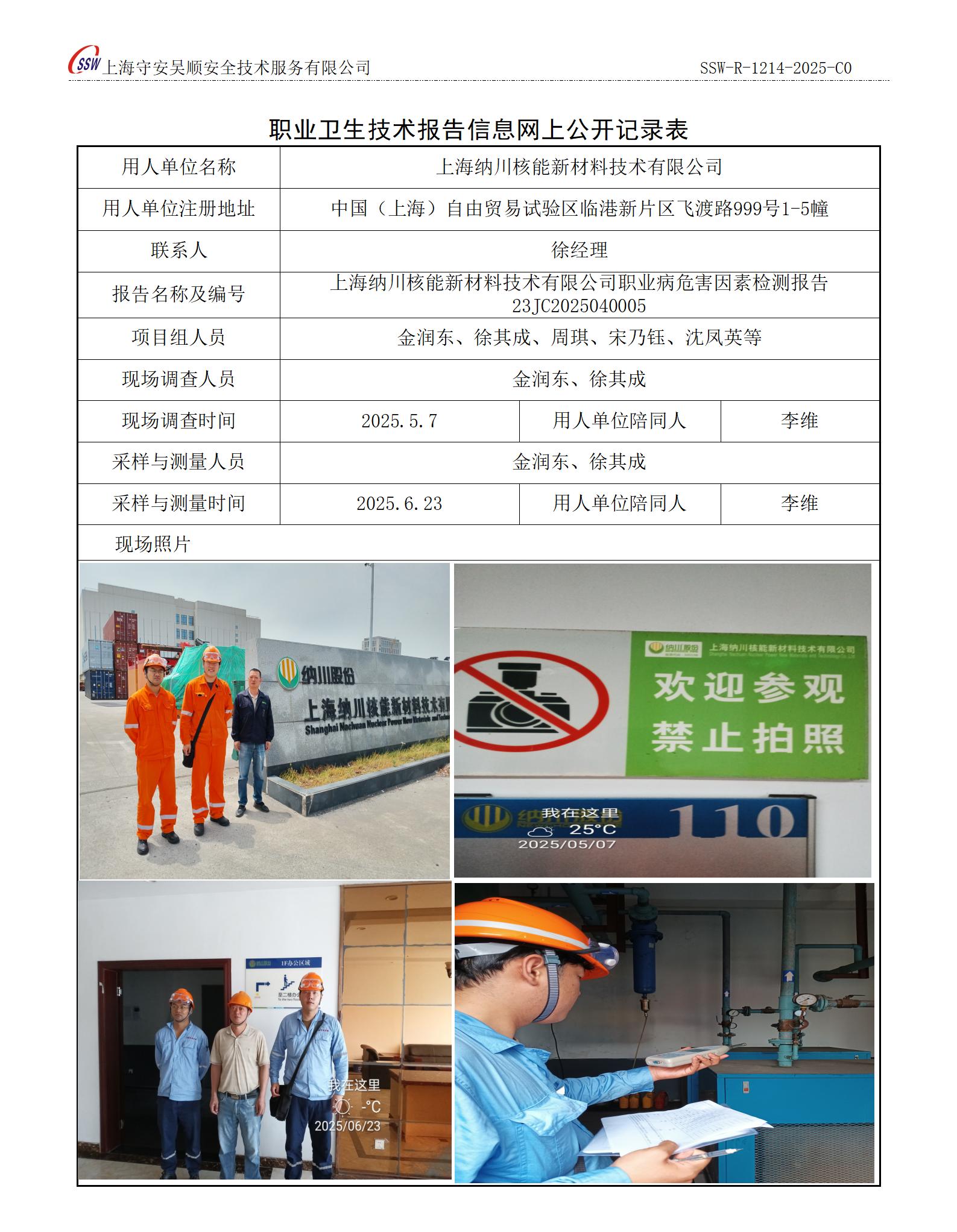 上海纳川核能新材料技术有限公司职业病危害因素定期检测