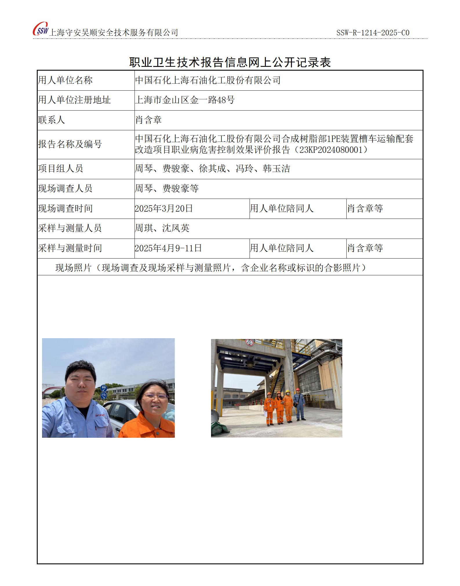 中国石化上海石油化工股份有限公司合成树脂部1PE装置槽车运输配套改造项目职业病危害控制效果评价