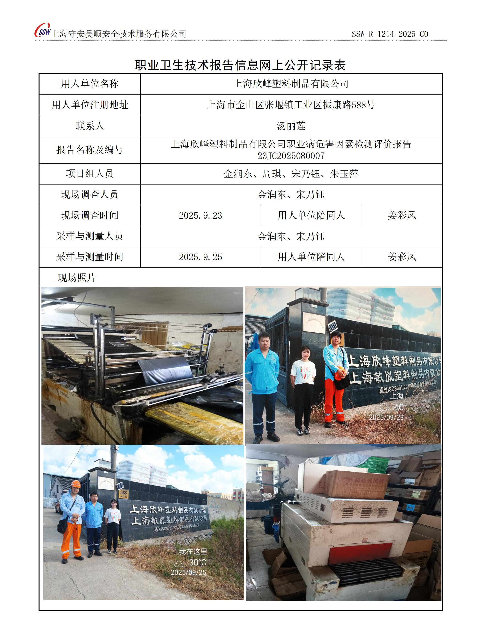 上海欣峰塑料制品有限公司职业病危害因素定期检测