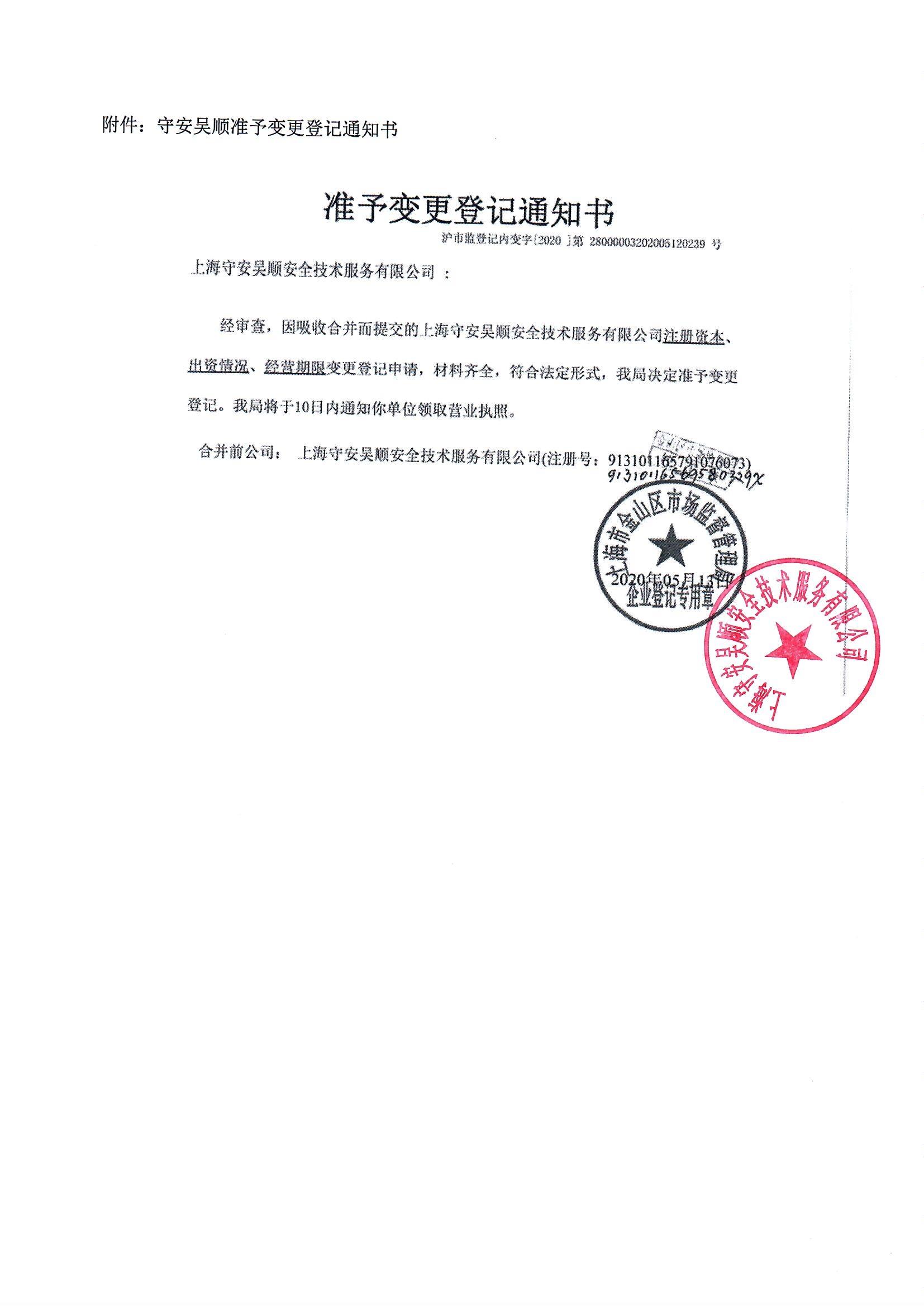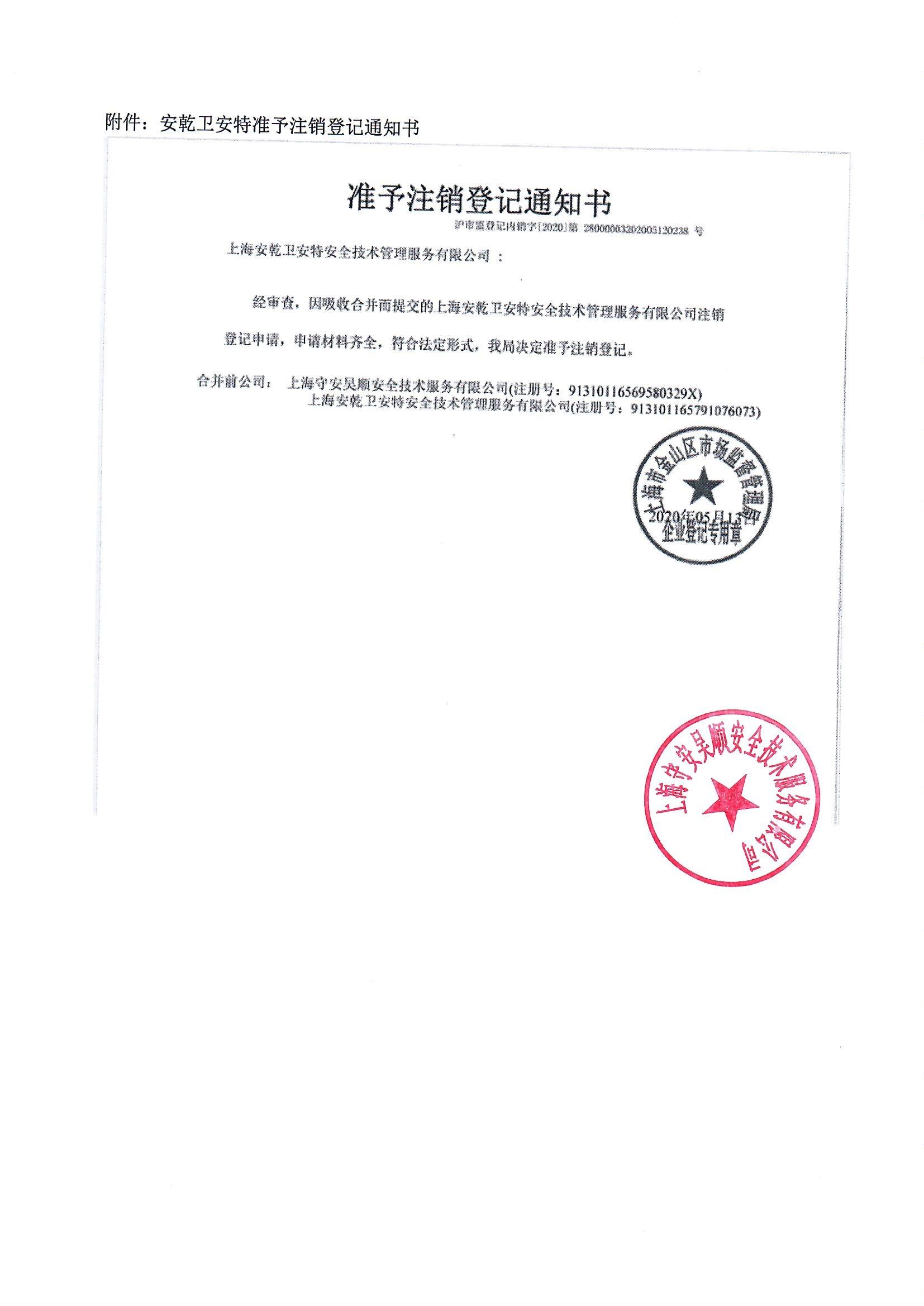 关于上海守安吴顺安全技术服务有限公司吸收合并上海安乾卫安特安全技术管理服务有限公司公告