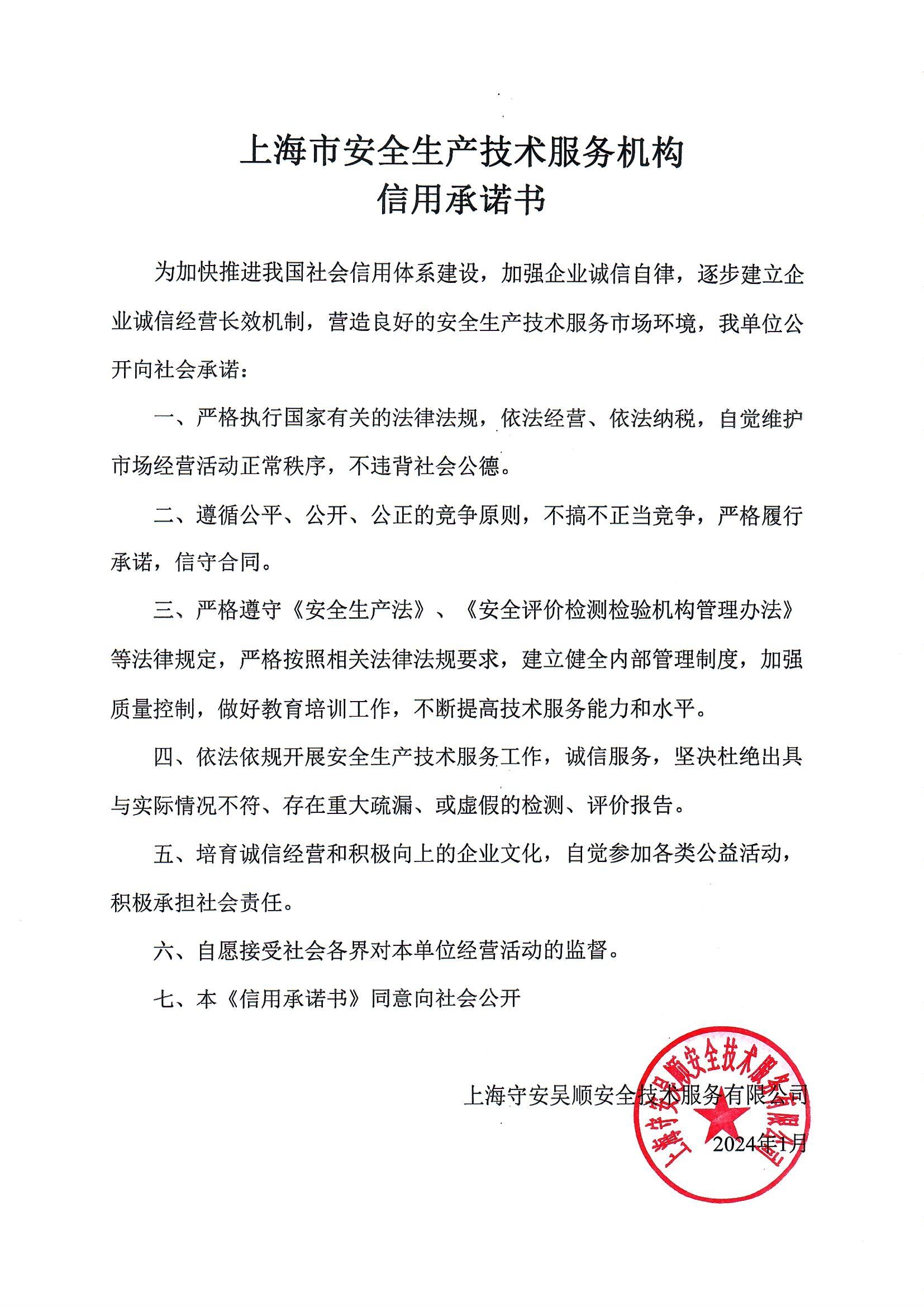 上海市安全生产技术服务机构信用承诺书