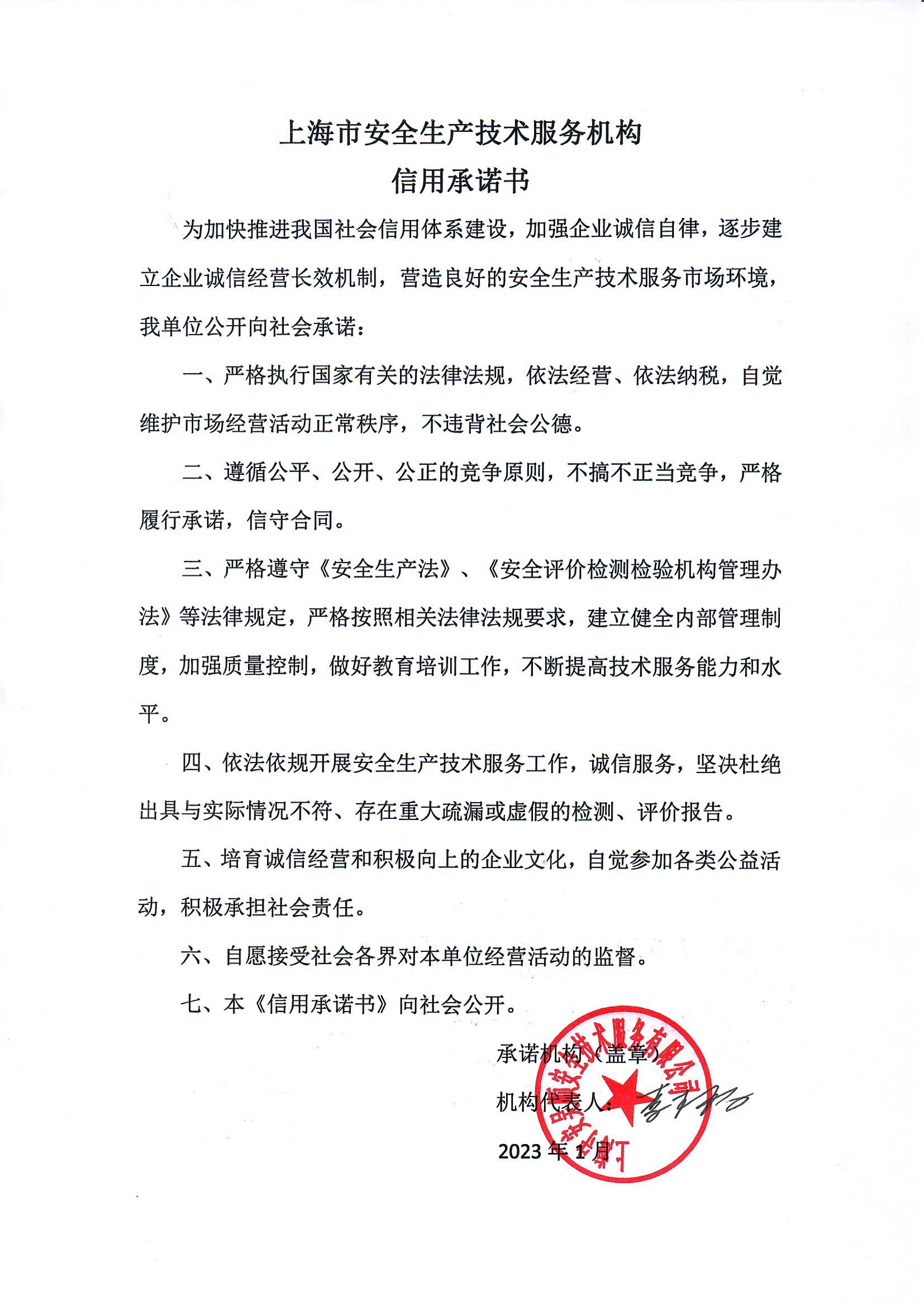 上海市安全生产技术服务机构信用承诺书
