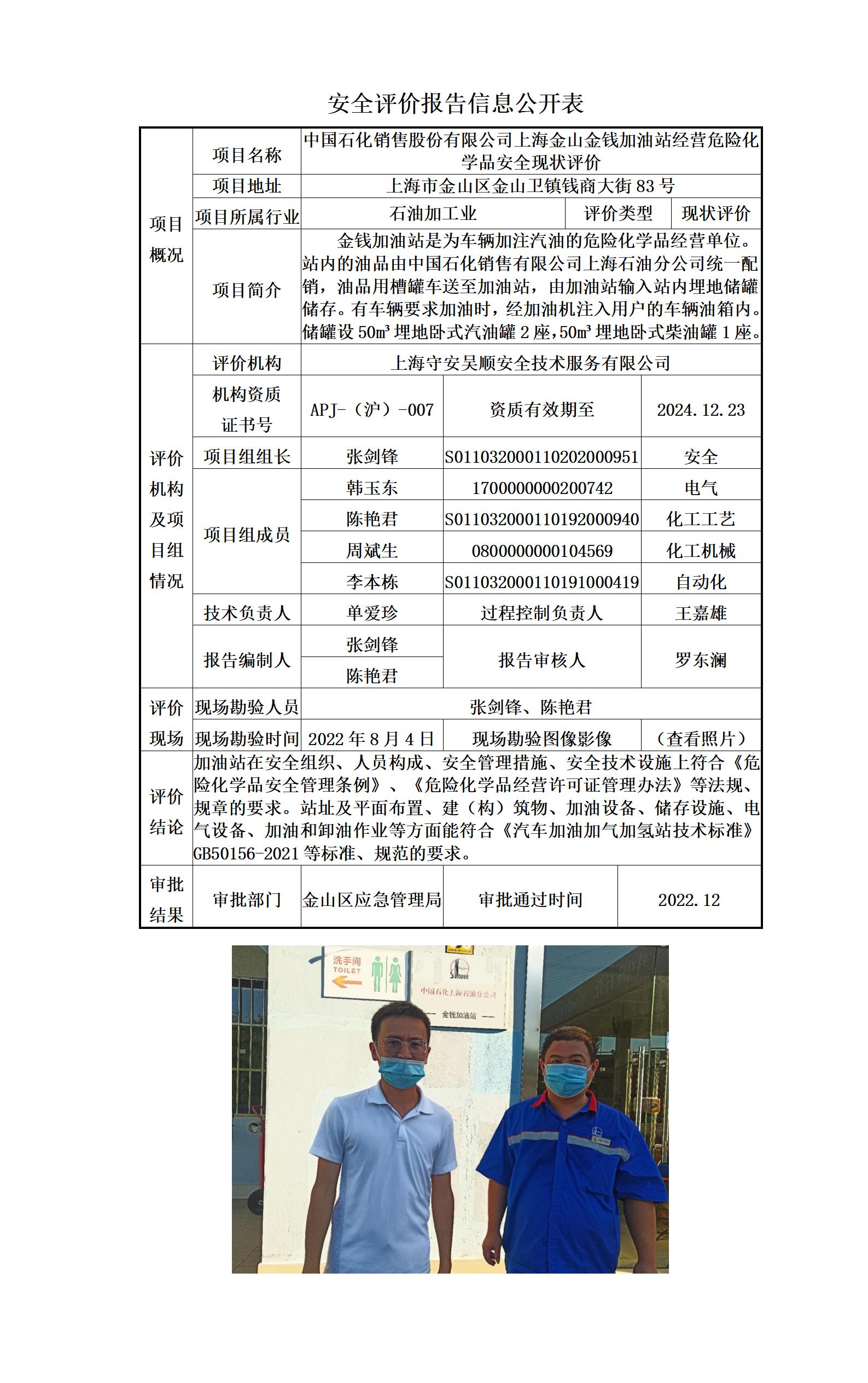 中国石化销售股份有限公司上海金山金钱加油站经营危险化学品安全现状评价
