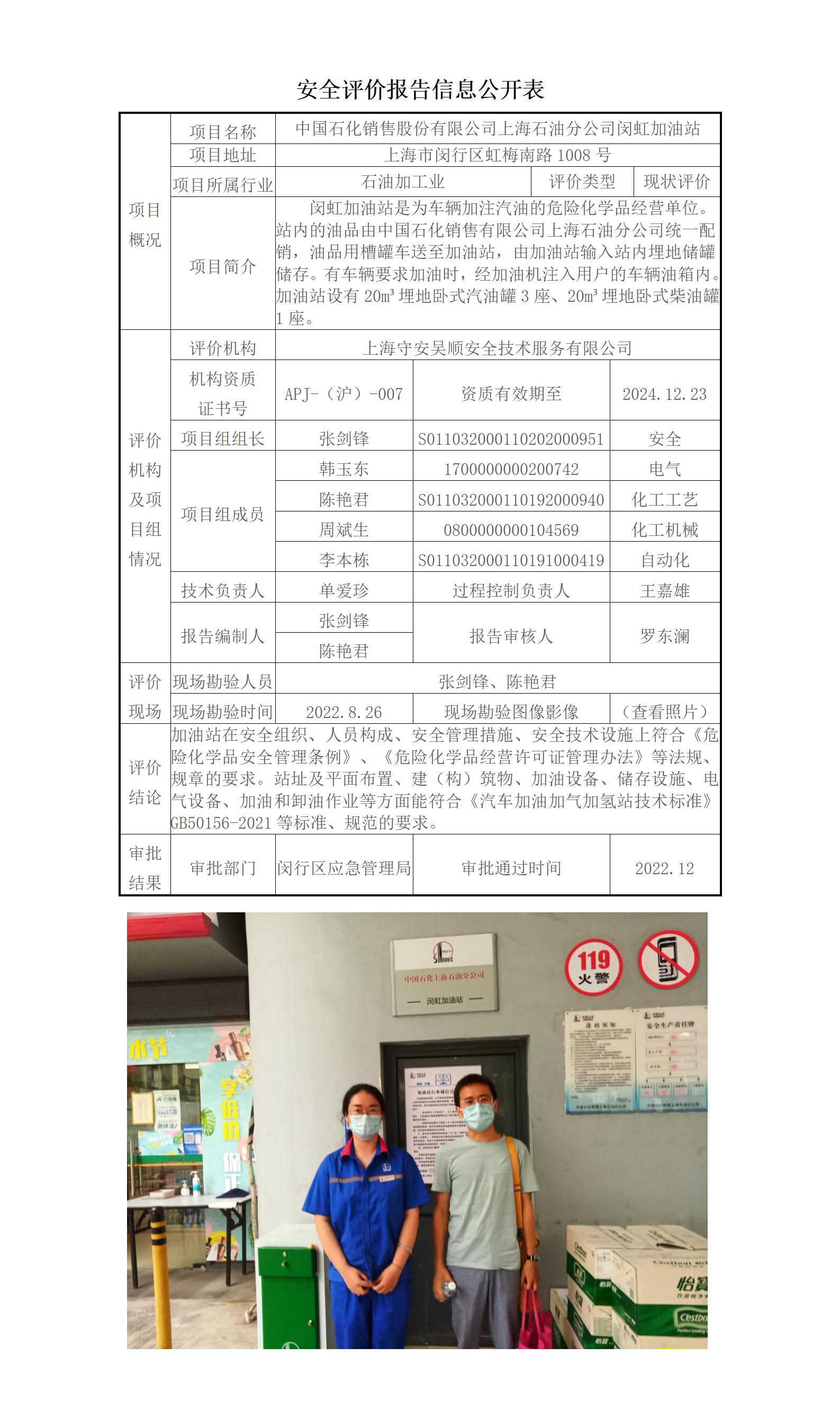 中国石化销售股份有限公司上海石油分公司闵虹加油站经营危险化学品安全现状评价