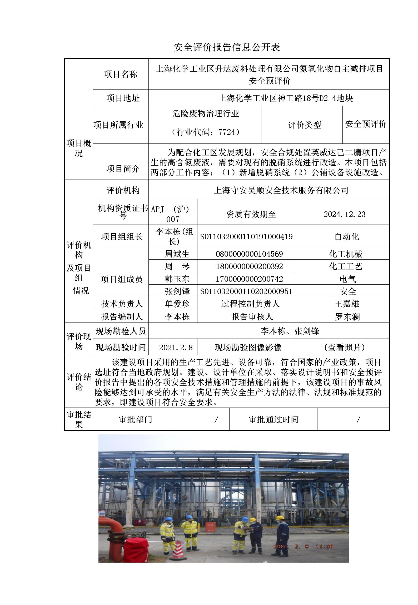 上海化学工业区升达废料处理有限公司氮氧化物自主减排项目安全预评价