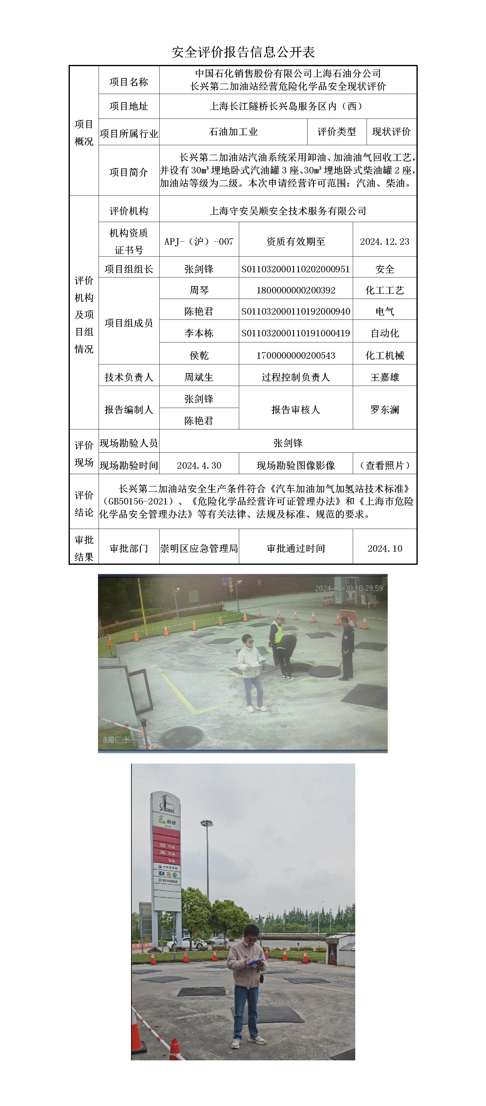 中国石化销售股份有限公司上海石油分公司长兴第二加油站经营危险化学品安全现状评价