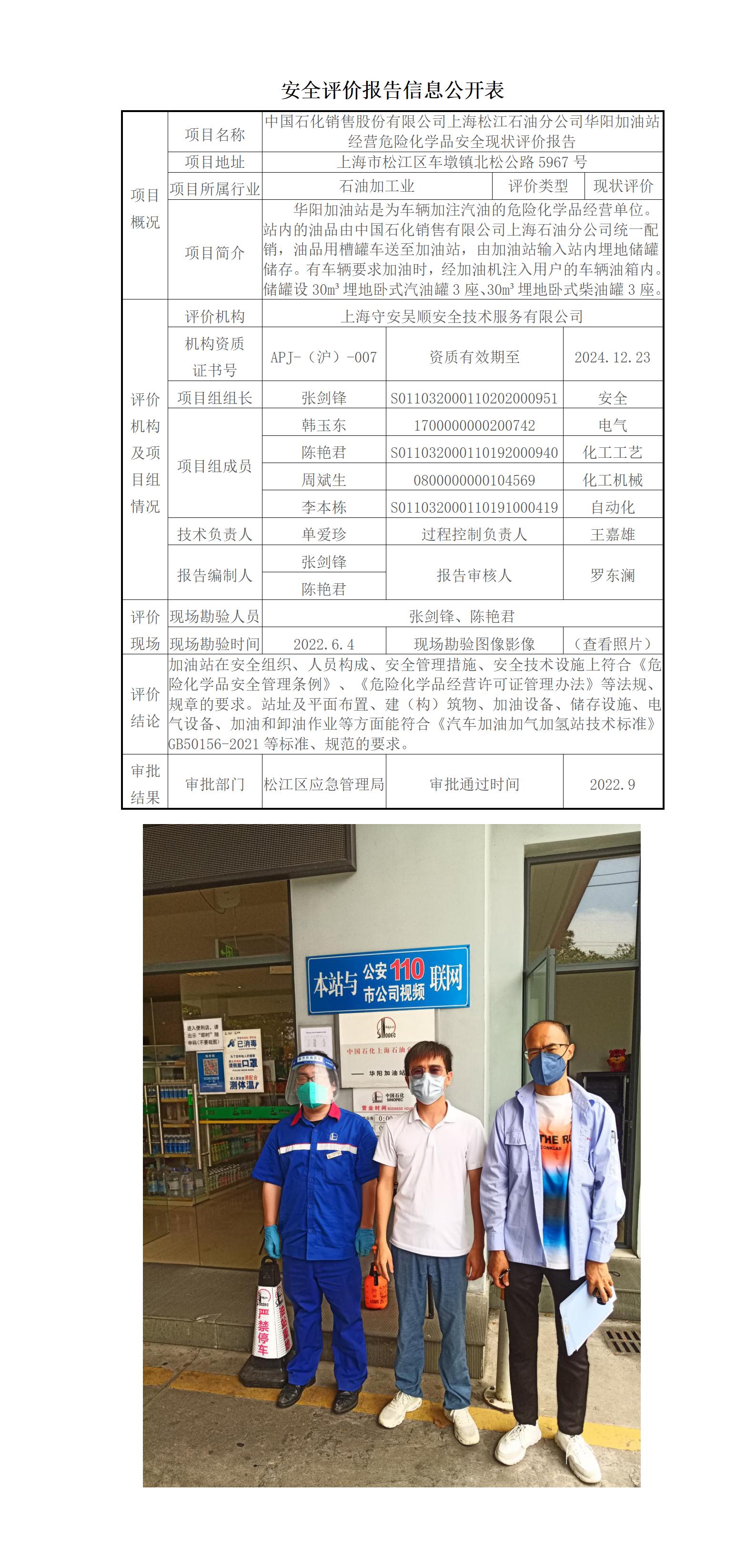 中国石化销售股份有限公司上海松江石油分公司华阳加油站经营危险化学品安全现状评价报告