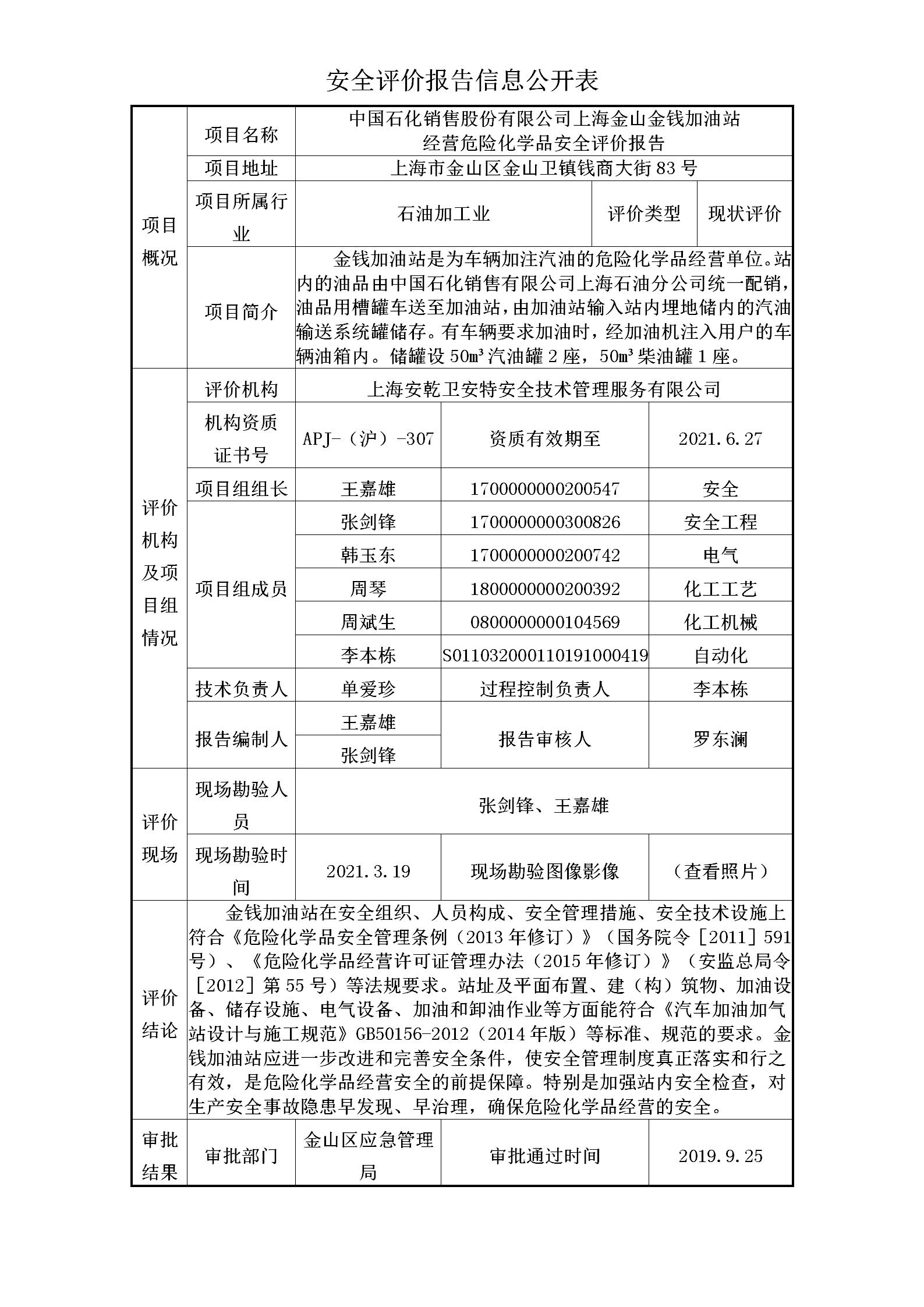 中国石化销售股份有限公司上海金山金钱加油站 经营危险化学品安全评价报告