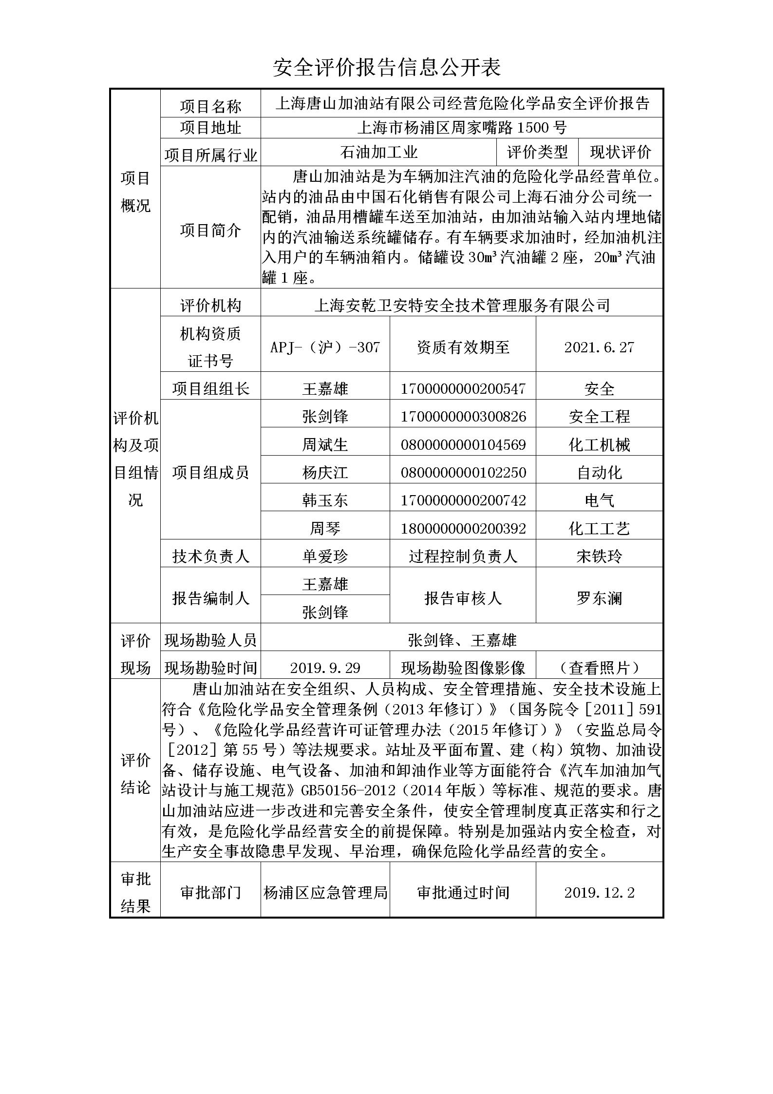 上海唐山加油站有限公司经营危险化学品安全评价报告