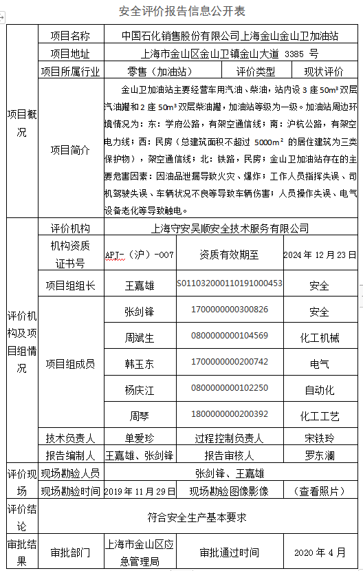 中国石化销售股份有限公司上海金山金山卫加油站安全现状评价报告