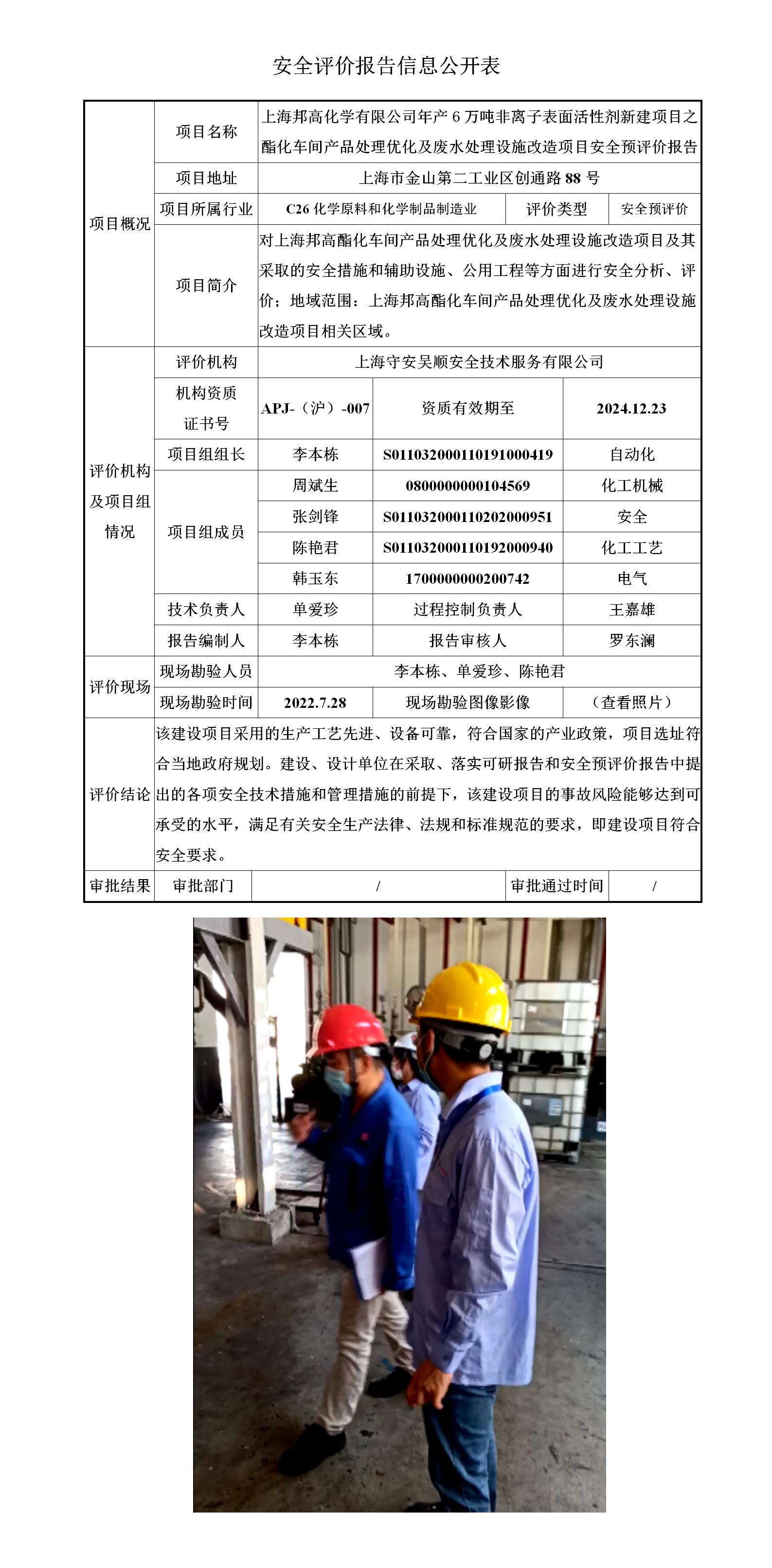 上海邦高化学有限公司年产6万吨非离子表面活性剂新建项目之酯化车间产品处理优化及废水处理设施改造项目安全预评价报告