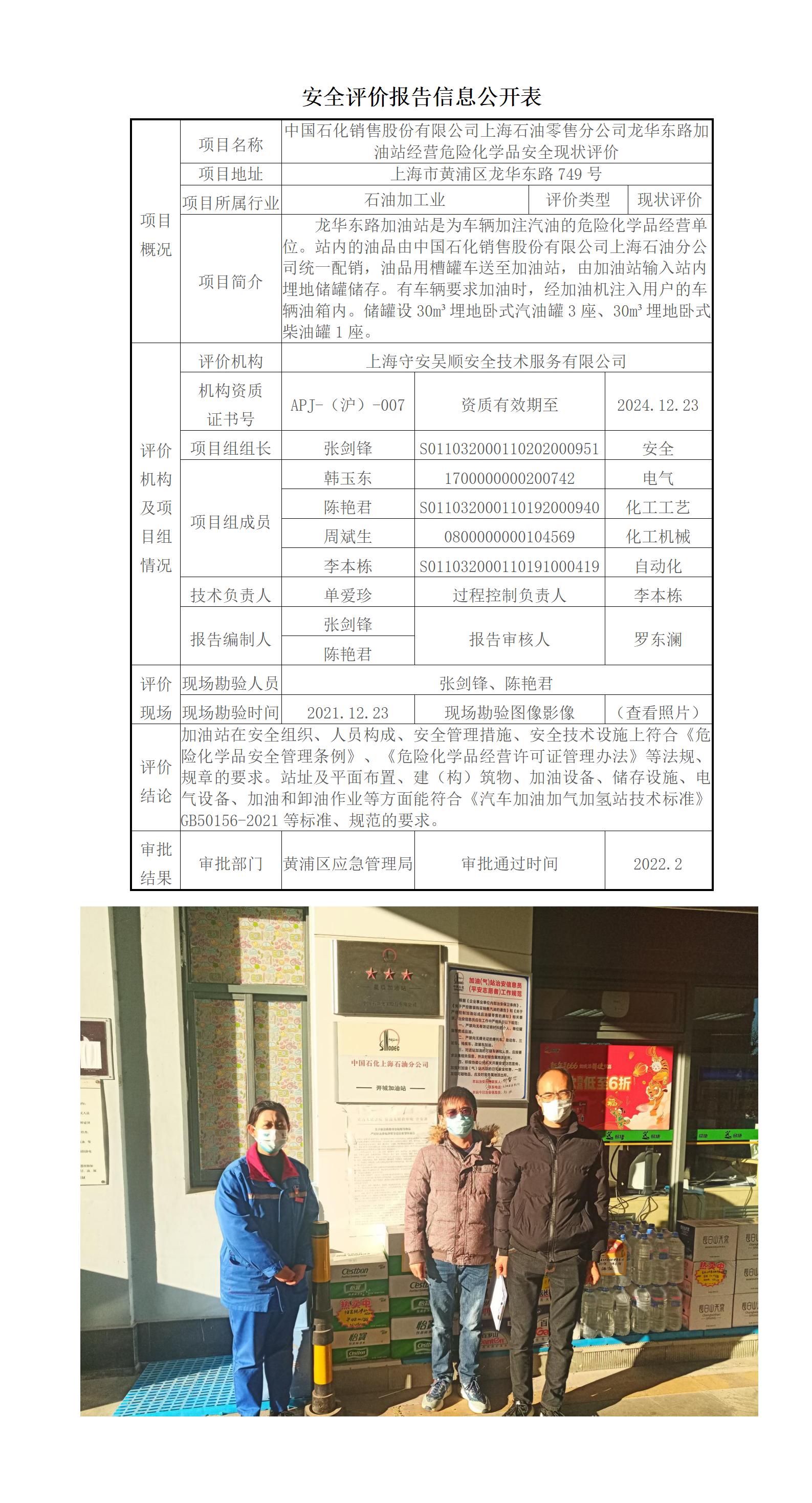 中国石化销售股份有限公司上海石油零售分公司龙华东路加油站经营危险化学品安全现状评价