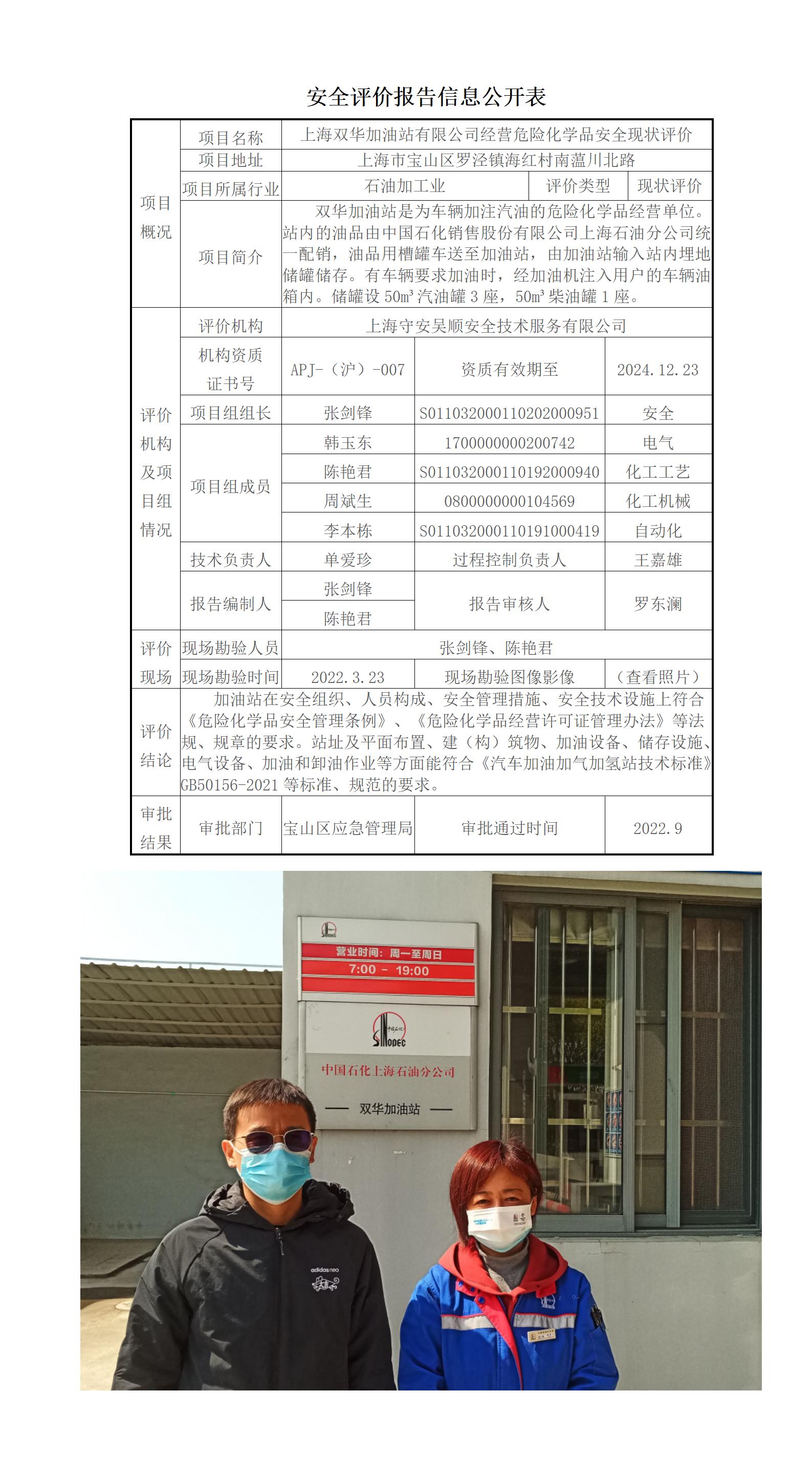 上海双华加油站有限公司经营危险化学品安全现状评价