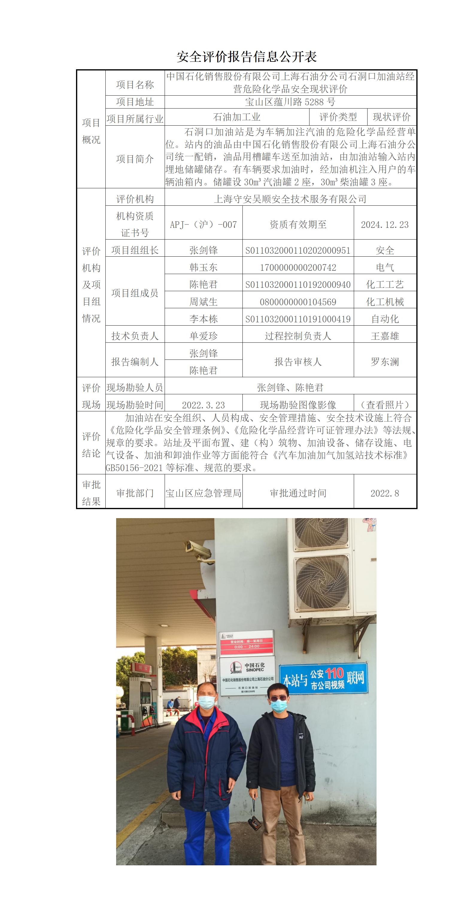 中国石化销售有限公司上海石油分公司石洞口加油站经营危险化学品安全现状评价