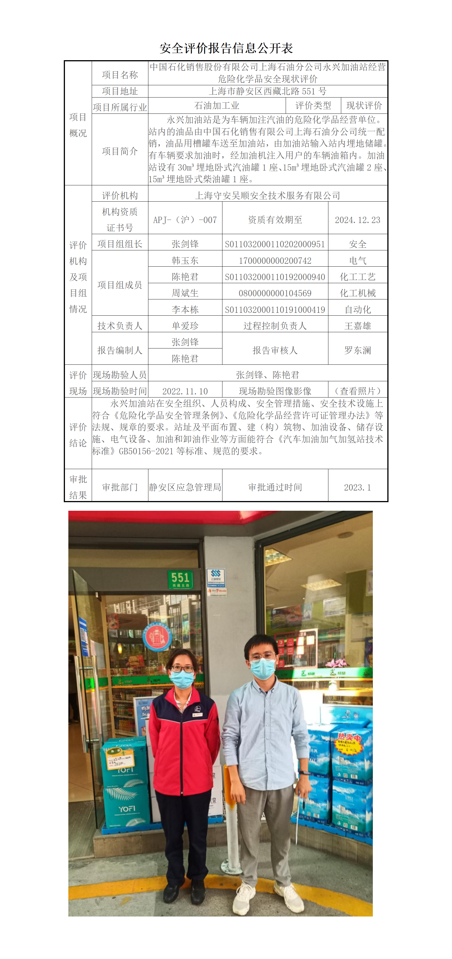 中国石化销售股份有限公司上海石油分公司永兴加油站经营危险化学品安全现状评价