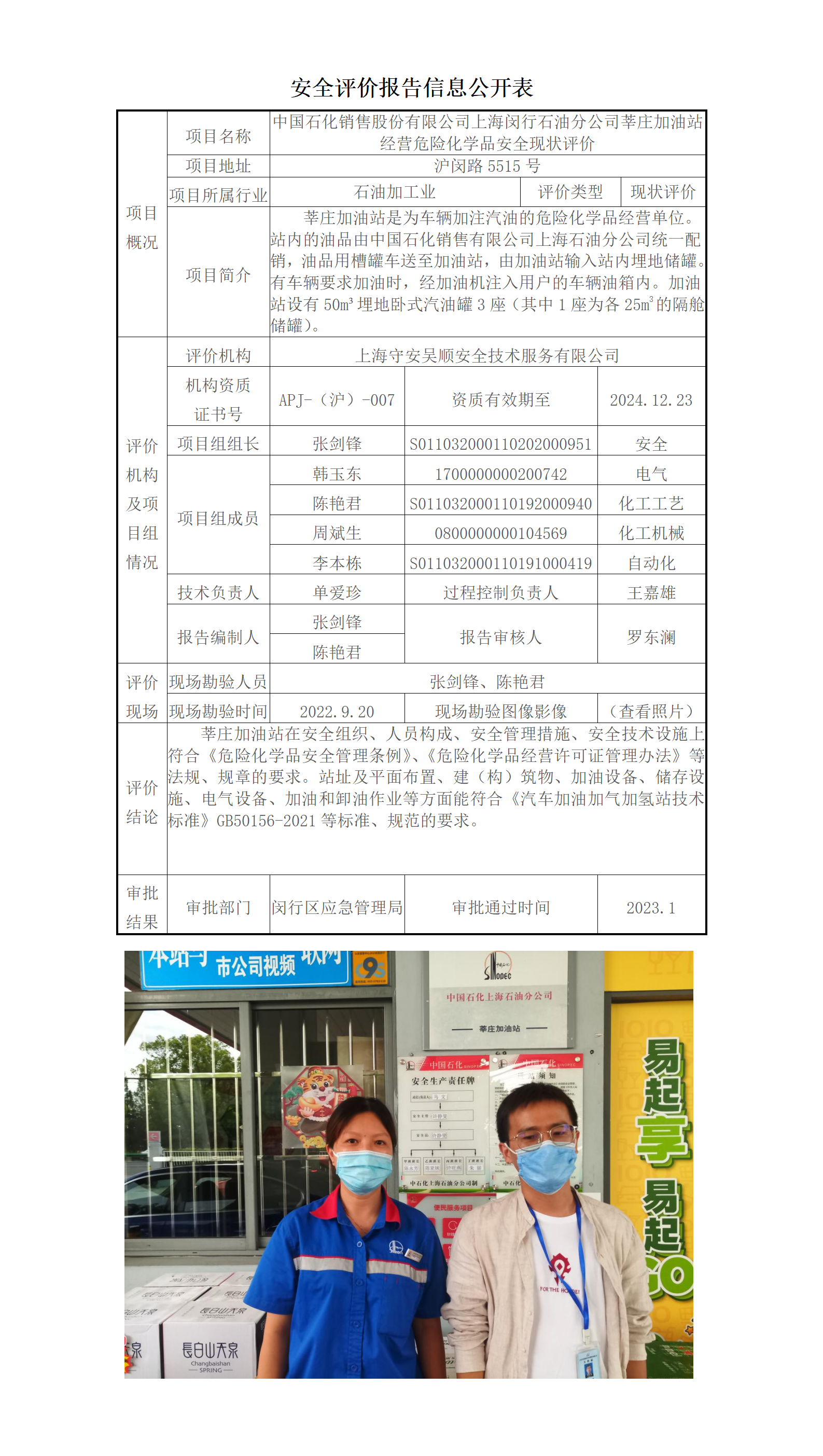 中国石化销售股份有限公司上海闵行石油分公司莘庄加油站经营危险化学品安全现状评价
