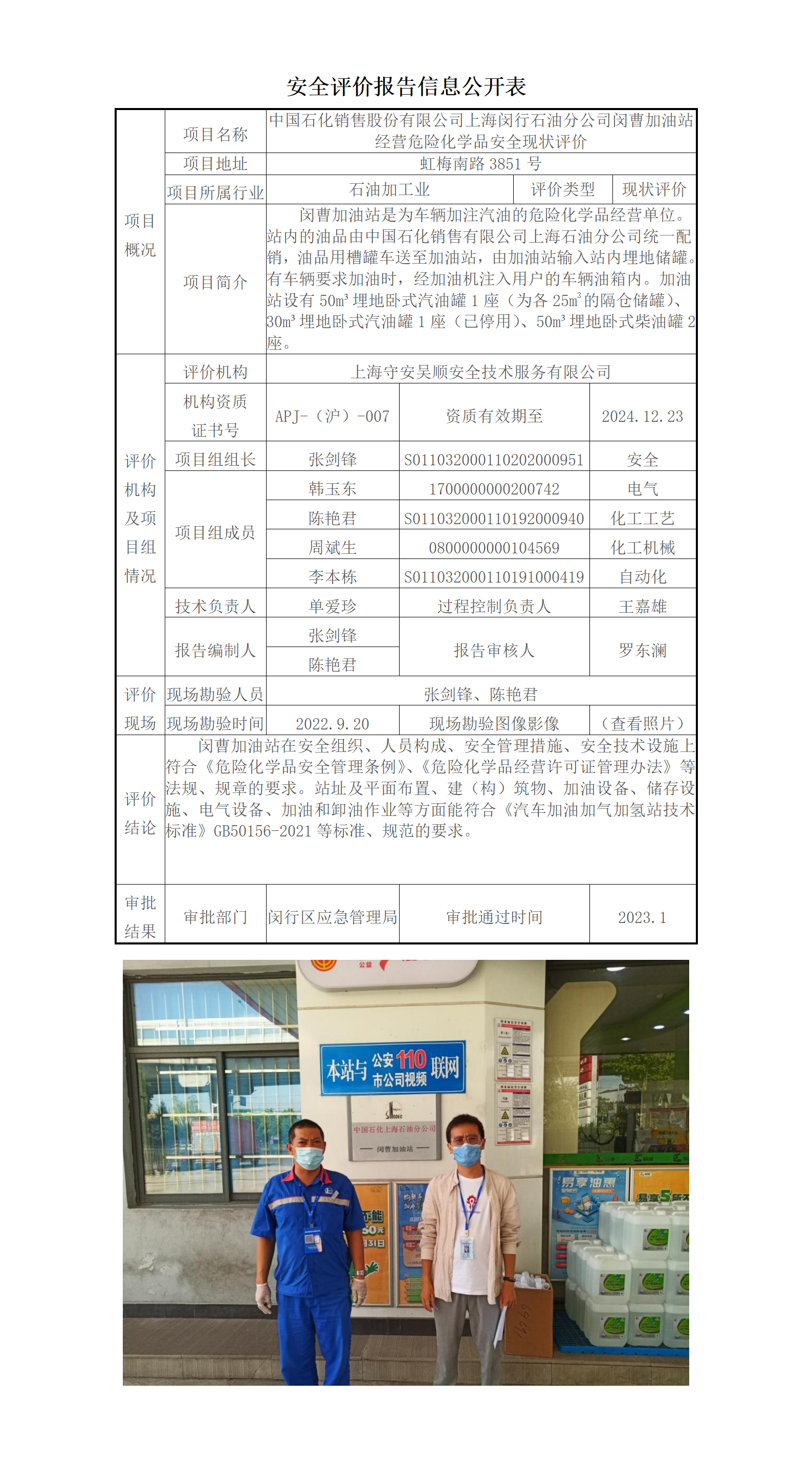 中国石化销售股份有限公司上海闵行石油分公司闵曹加油站经营危险化学品安全现状评价