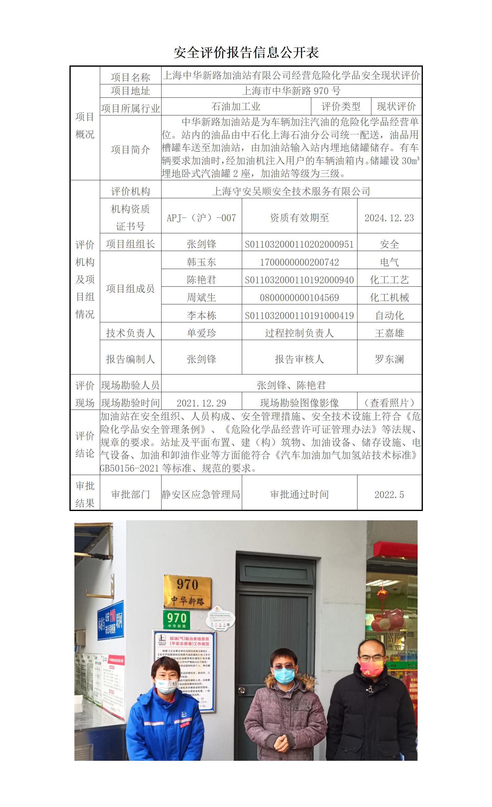 上海中华新路加油站有限公司经营危险化学品安全现状评价