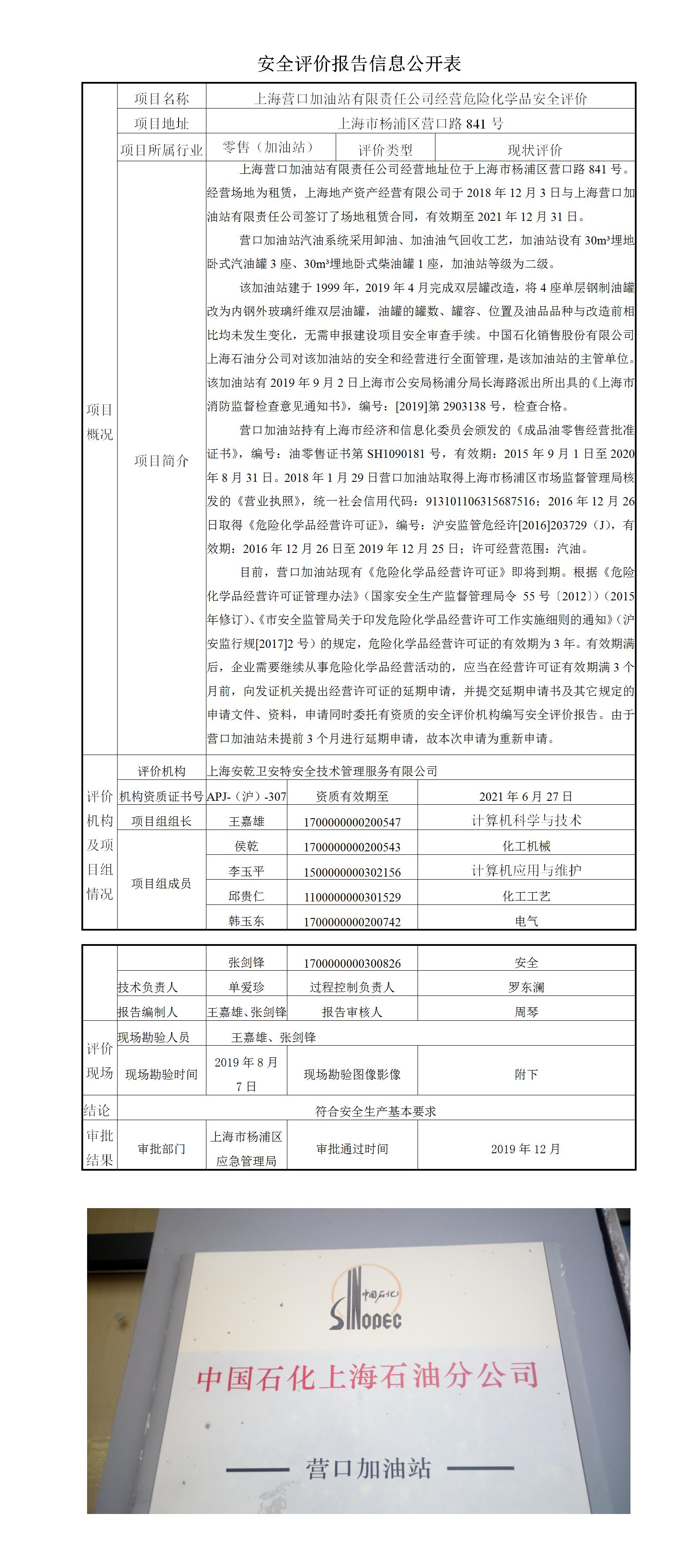 上海营口加油站有限责任公司经营危险化学品安全评价