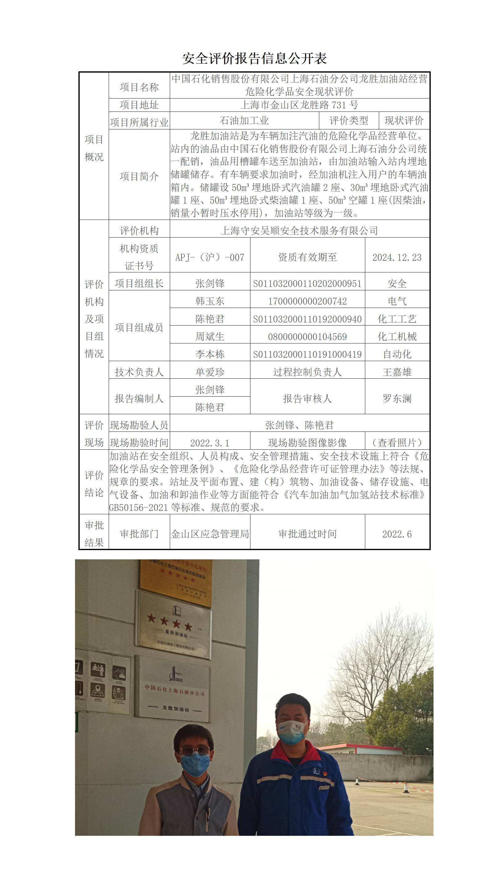 中国石化销售股份有限公司上海石油分公司龙胜加油站 经营危险化学品安全现状评价