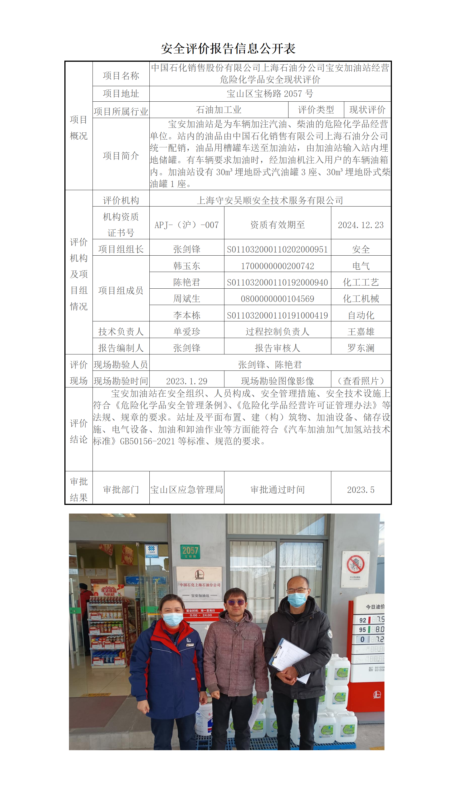 中国石化销售股份有限公司上海石油分公司宝安加油站经营危险化学品安全现状评价