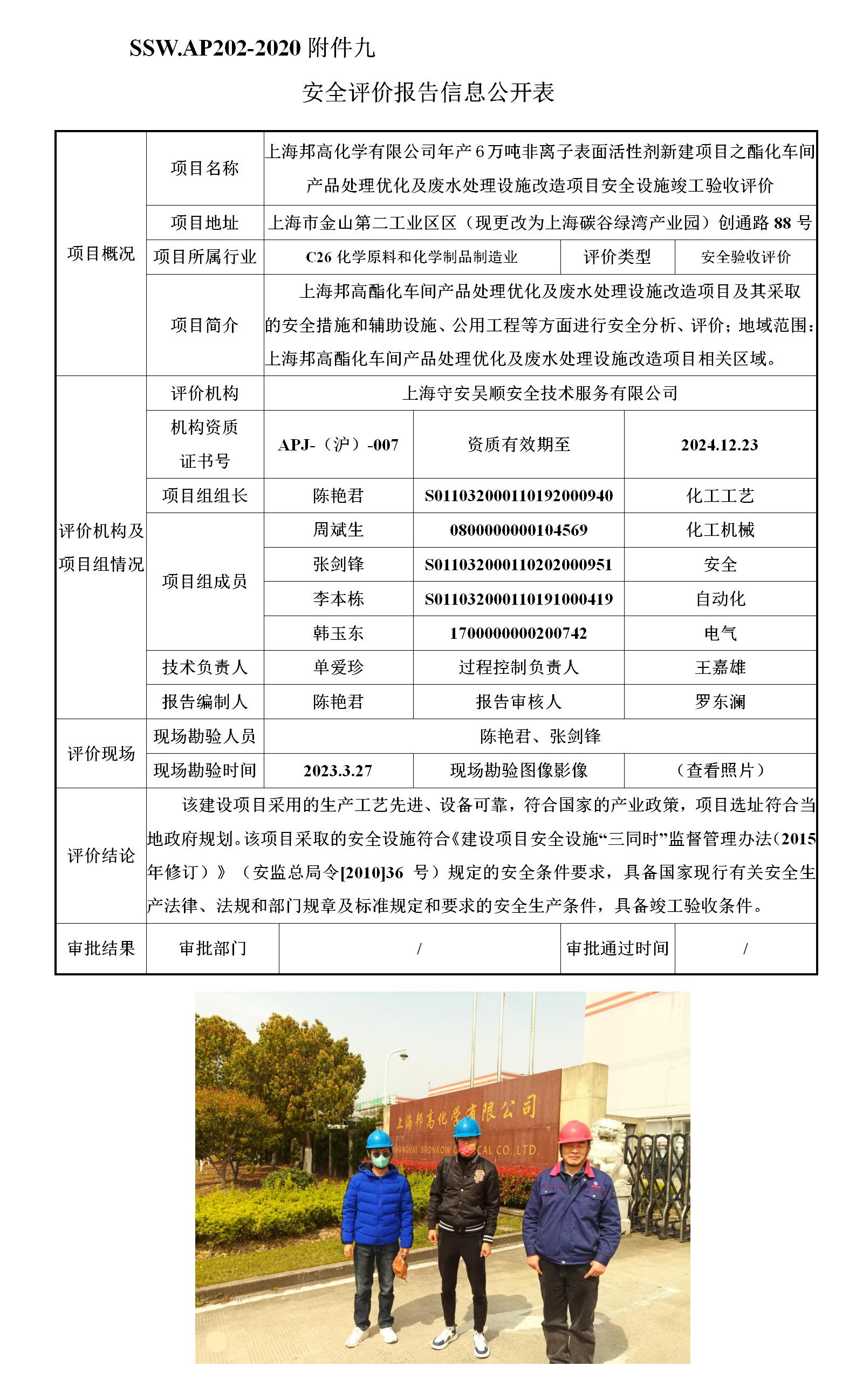 上海邦高化学有限公司年产6万吨非离子表面活性剂新建项目之酯化车间产品处理优化及废水处理设施改造项目安全设施竣工验收评价