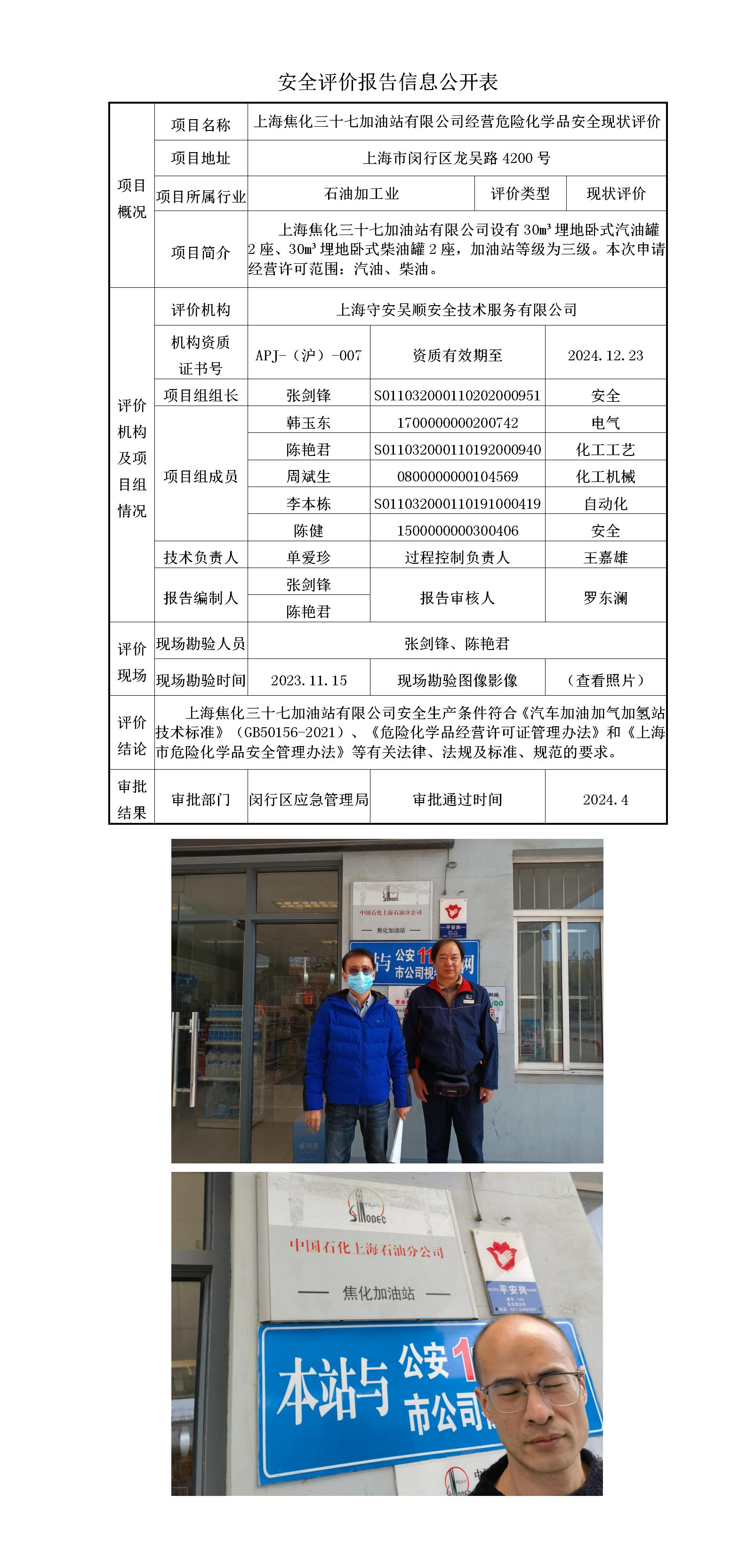上海焦化三十七加油站有限公司经营危险化学品安全现状评价