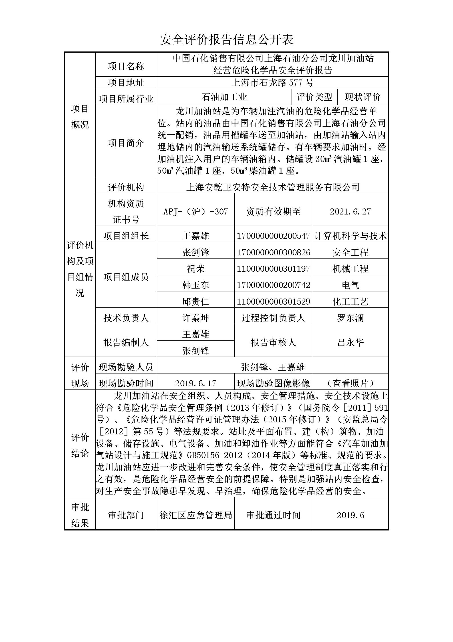 中国石化销售有限公司上海石油分公司龙川加油站经营危险化学品安全评价报告