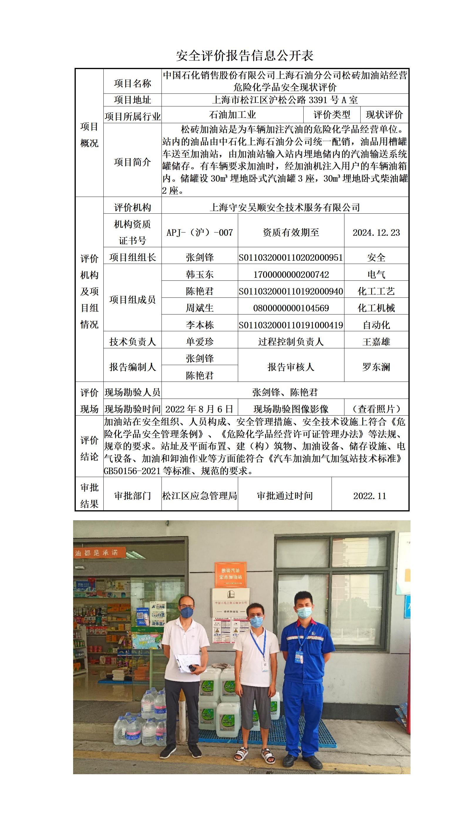 中国石化销售股份有限公司上海石油分公司松砖加油站经营危险化学品安全现状评价