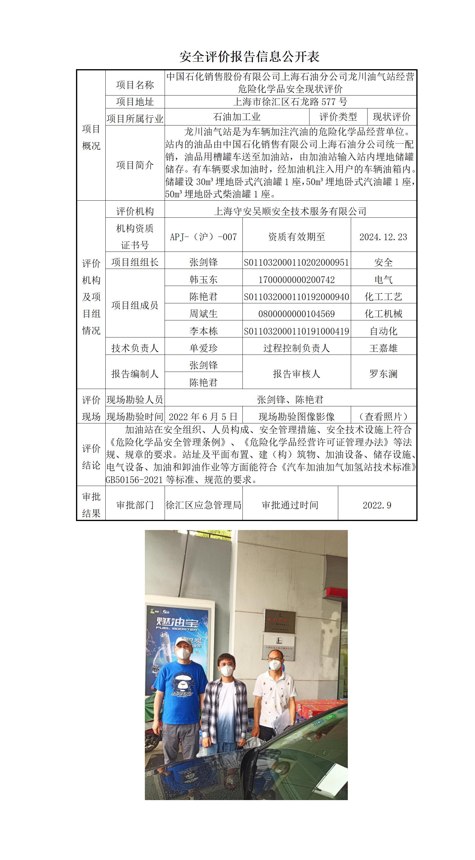 中国石化销售股份有限公司上海石油分公司龙川油气站经营危险化学品安全现状评价