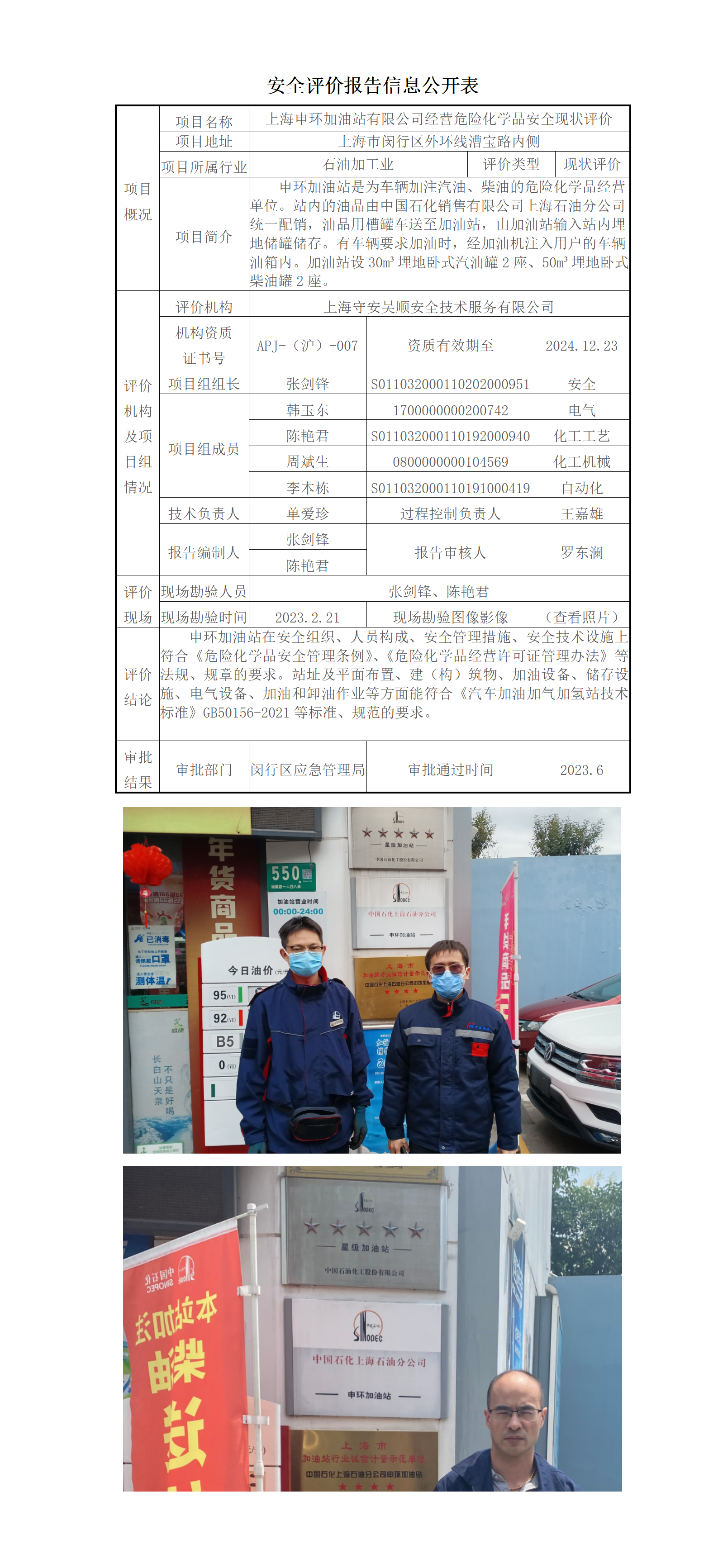 上海申环加油站有限公司经营危险化学品安全现状评价