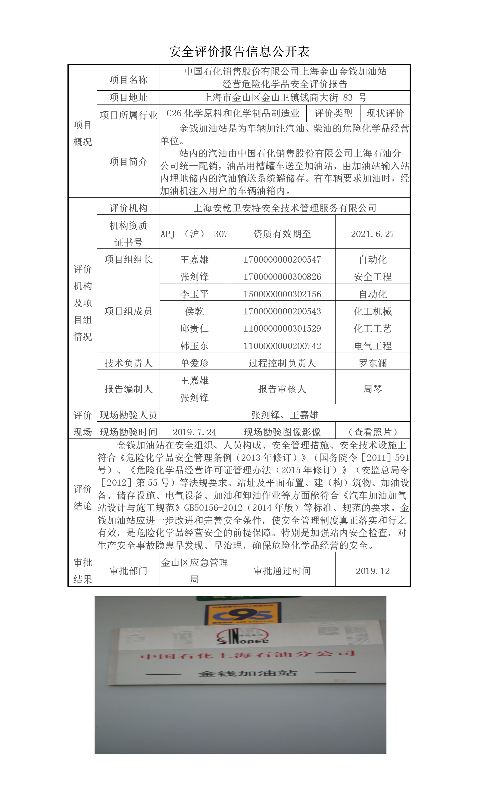 中国石化销售股份有限公司上海金山金钱加油站 经营危险化学品安全评价报告
