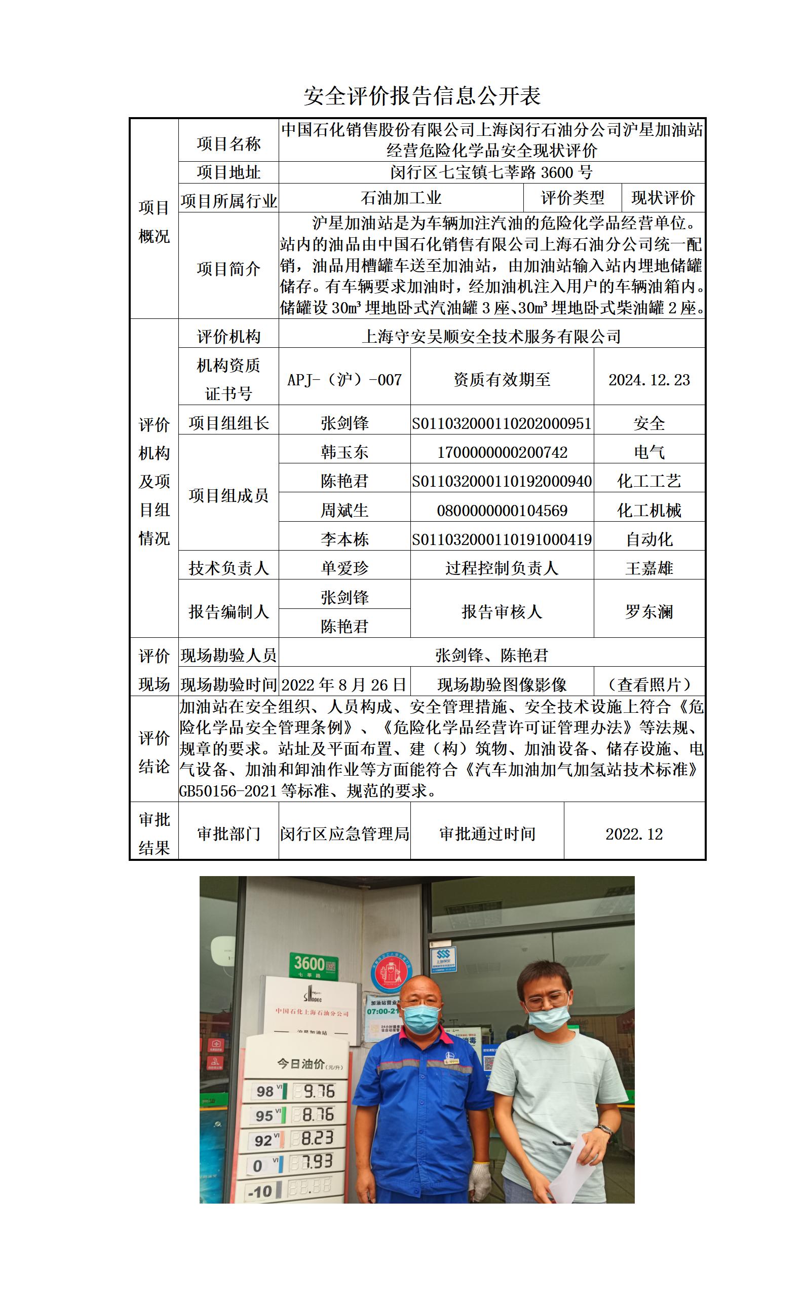 中国石化销售股份有限公司上海闵行石油分公司沪星加油站经营危险化学品安全现状评价