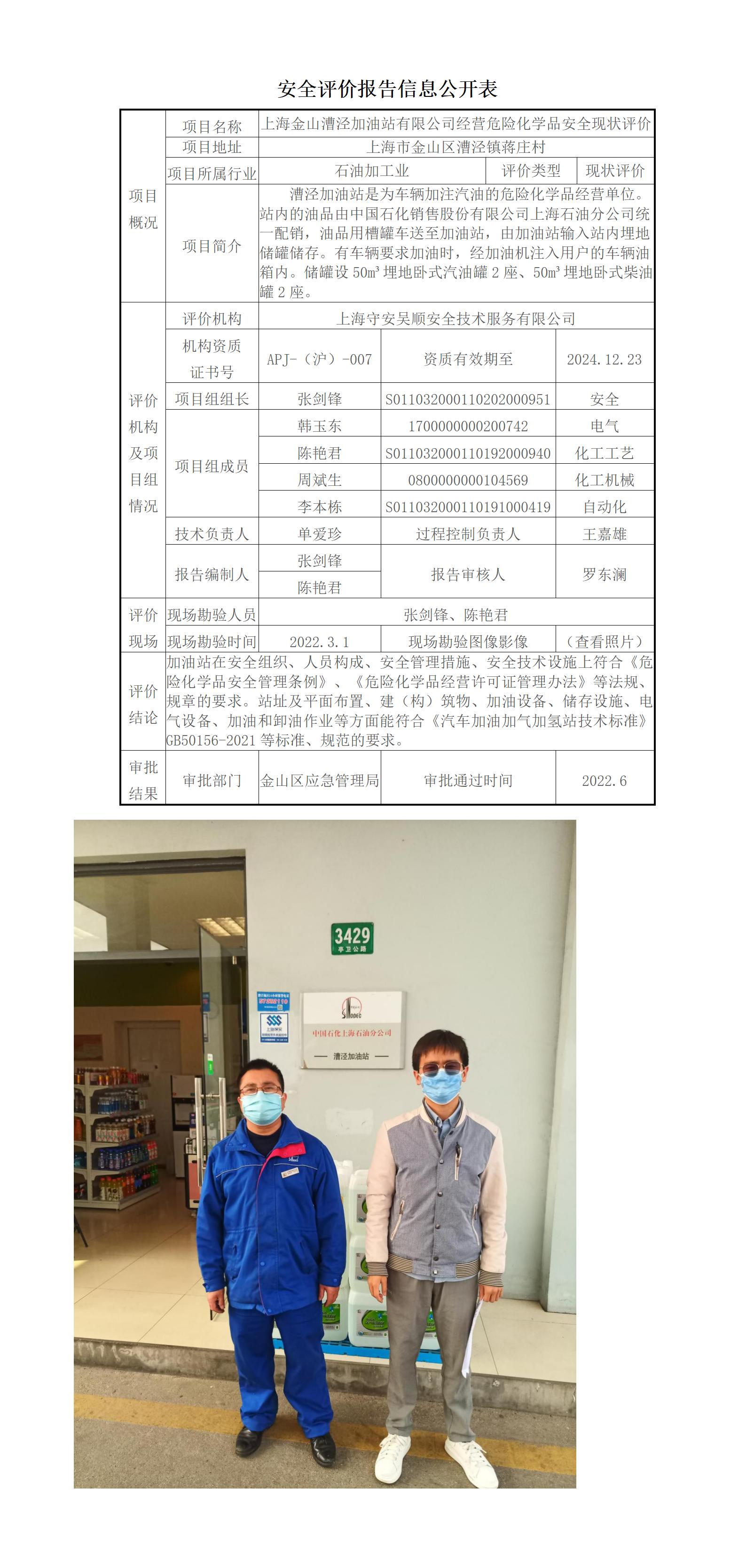 上海金山漕泾加油站有限公司经营危险化学品安全现状评价