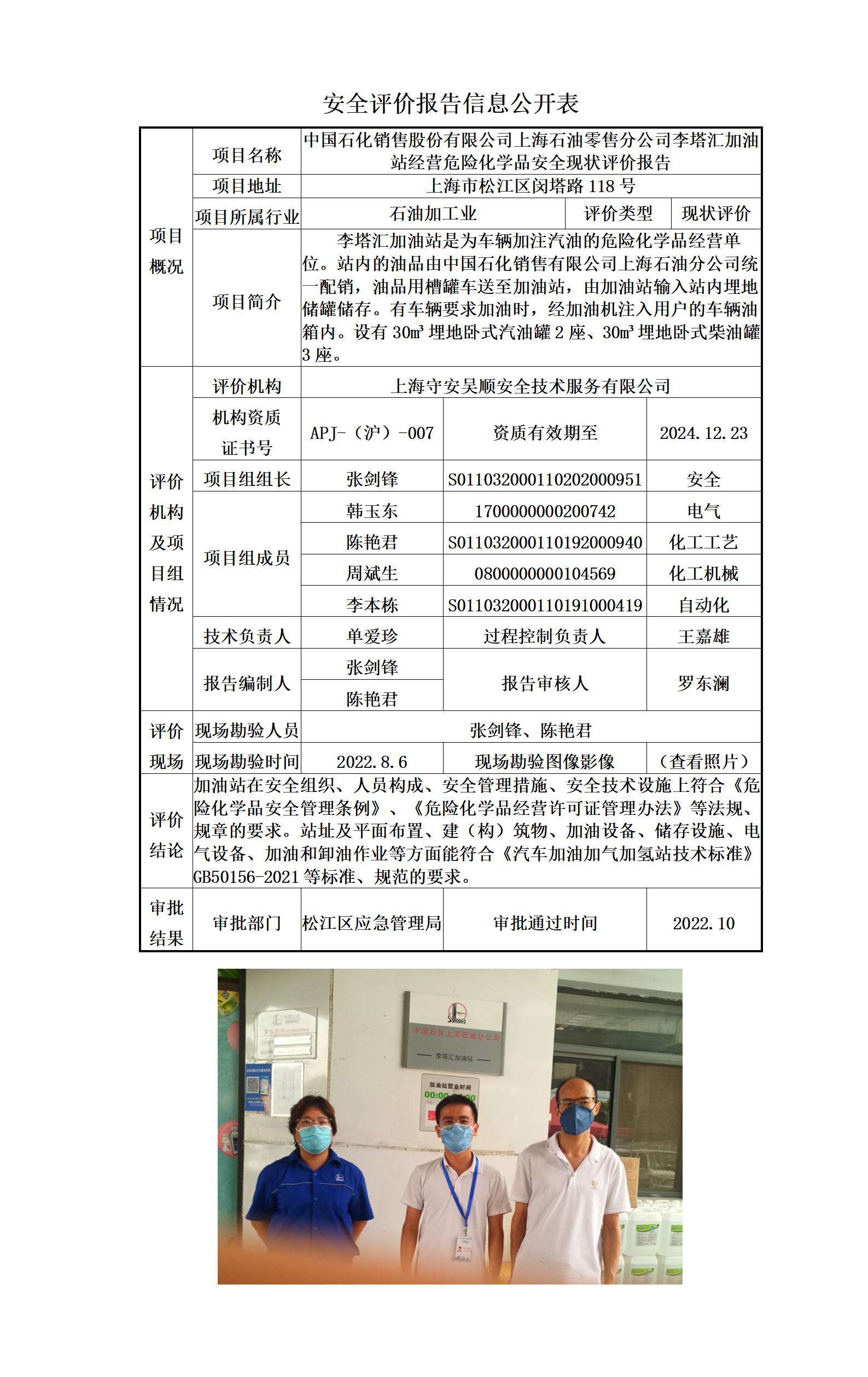 中国石化销售股份有限公司上海石油零售分公司李塔汇加油站经营危险化学品安全现状评价