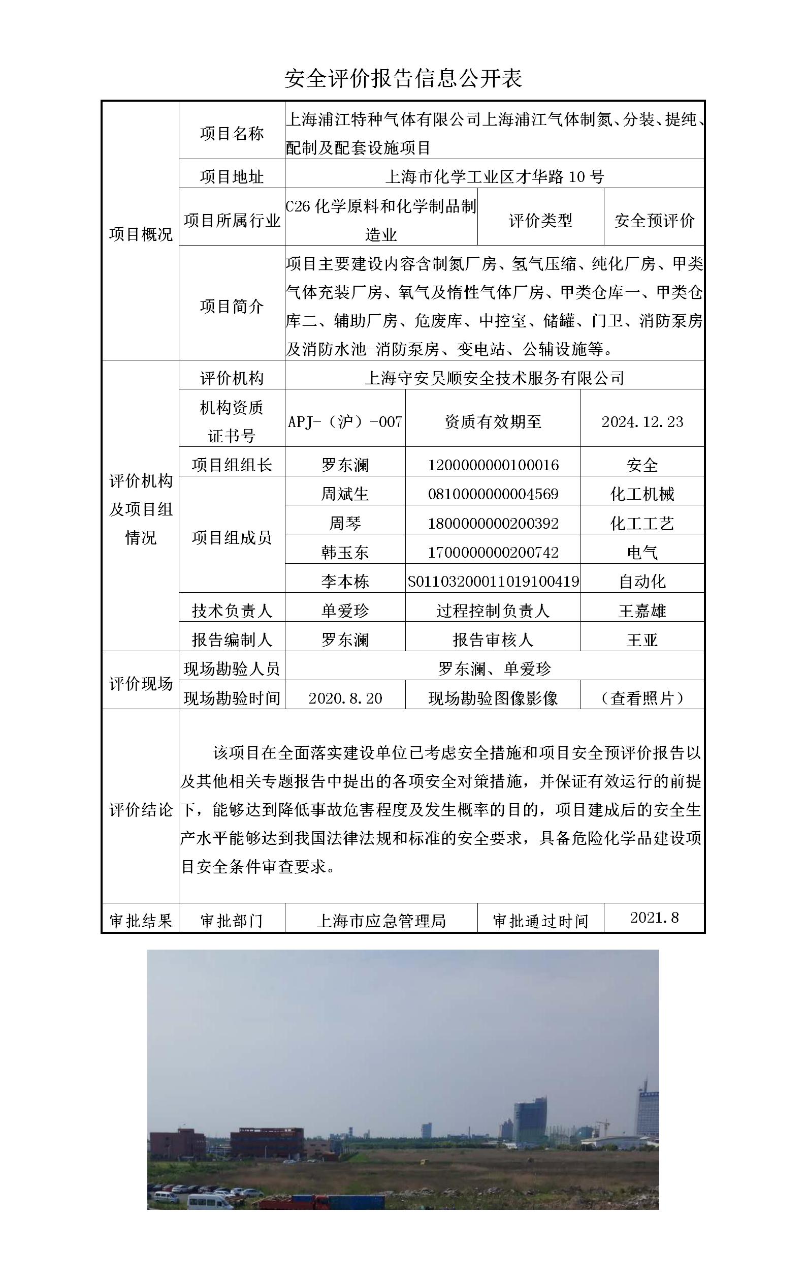 上海浦江特种气体有限公司上海浦江气体制氮、分装、提纯、配制及配套设施项目