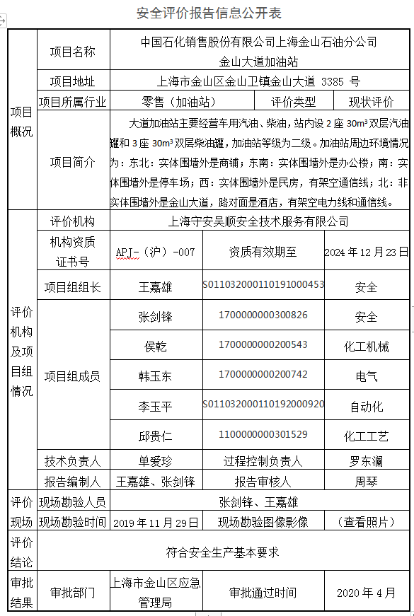 中国石化销售股份有限公司上海金山石油分公司金山大道加油站安全现状评价报告