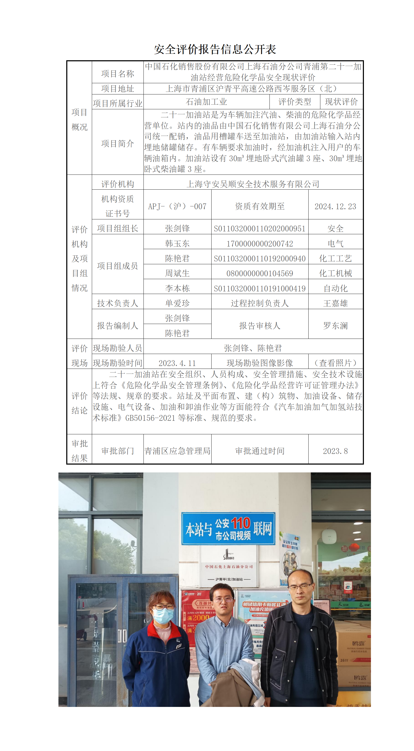 中国石化销售股份有限公司上海石油分公司青浦第二十一加油站经营危险化学品安全现状评价