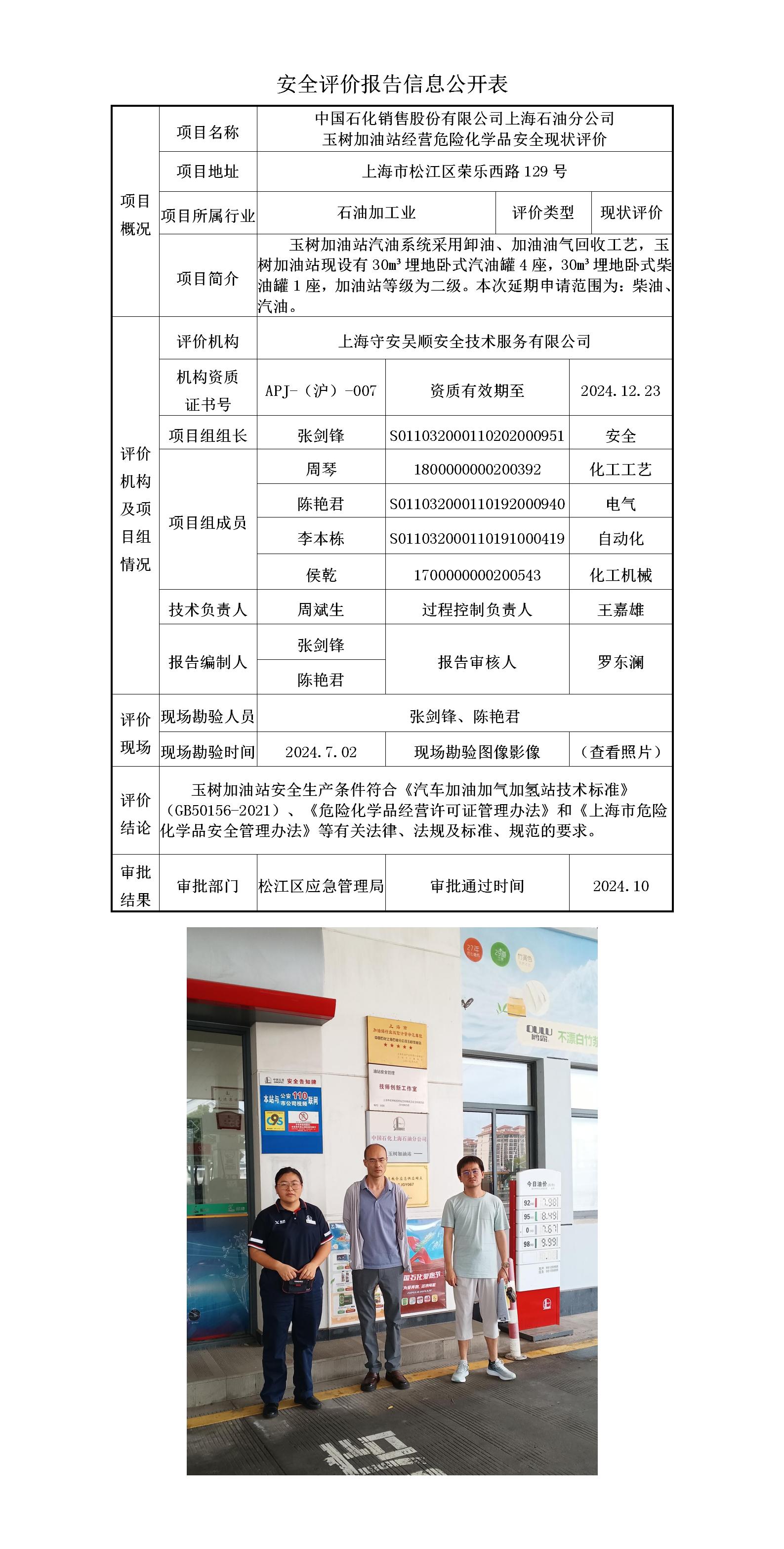 中国石化销售股份有限公司上海石油分公司玉树加油站经营危险化学品安全现状评价