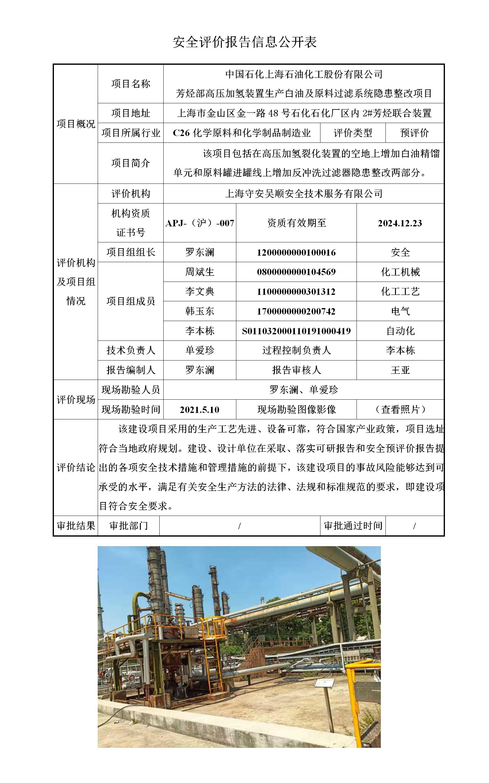 中国石化上海石油化工股份有限公司芳烃部高压加氢装置生产白油及原料过滤系统隐患整改项目