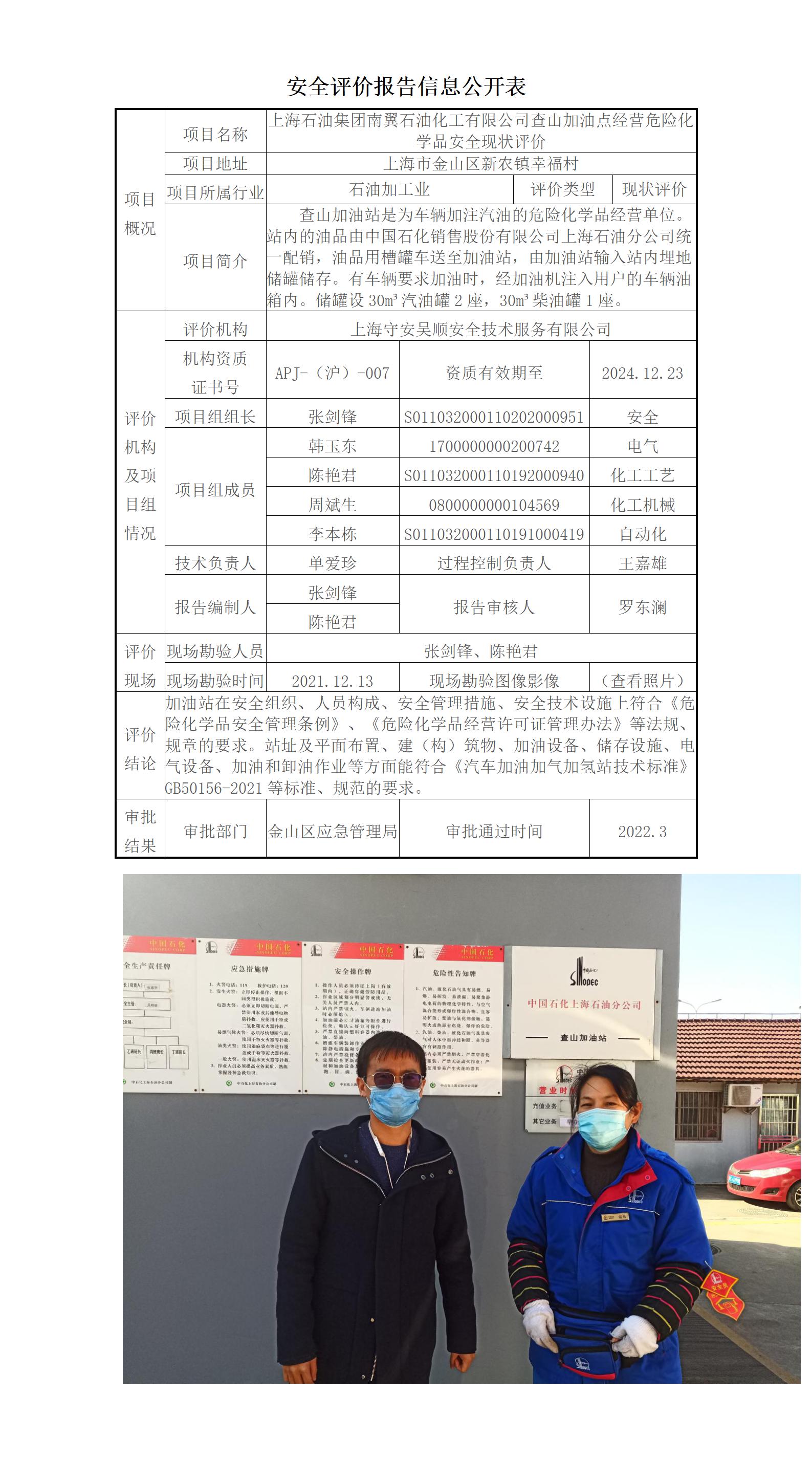 上海石油集团南翼石油化工有限公司查山加油点经营危险化学品安全现状评价