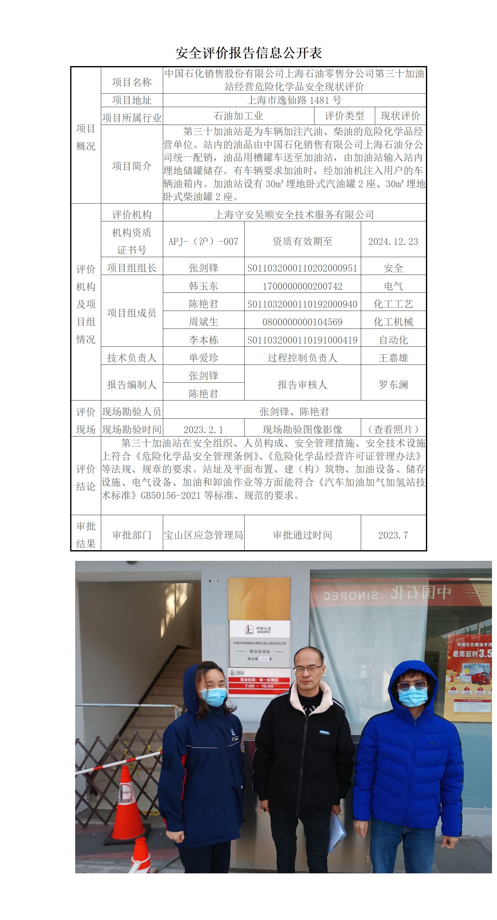 中国石化销售股份有限公司上海石油零售分公司第三十加油站经营危险化学品安全现状评价
