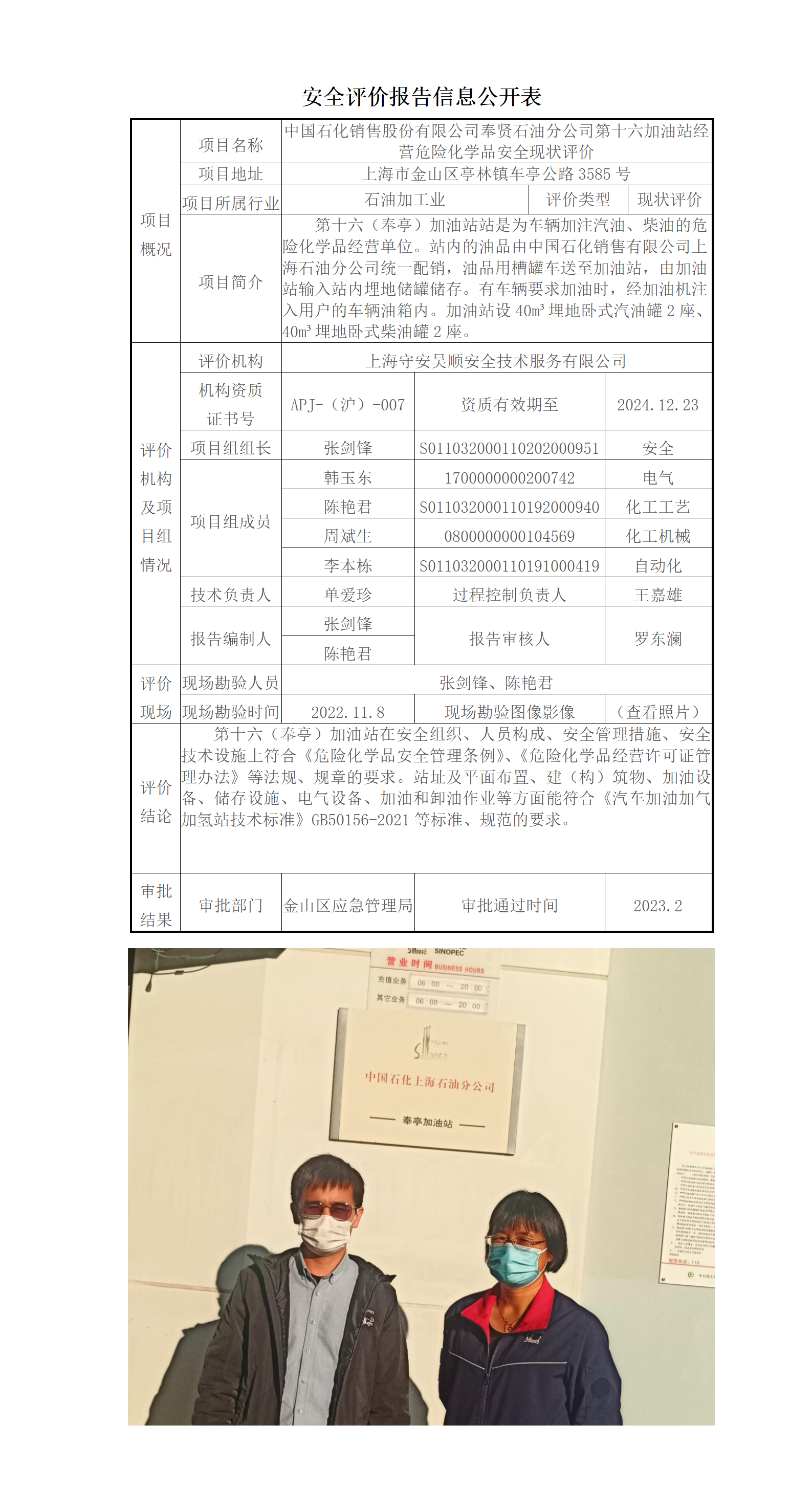 中国石化销售股份有限公司上海奉贤石油分公司第十六加油站经营危险化学品安全现状评价