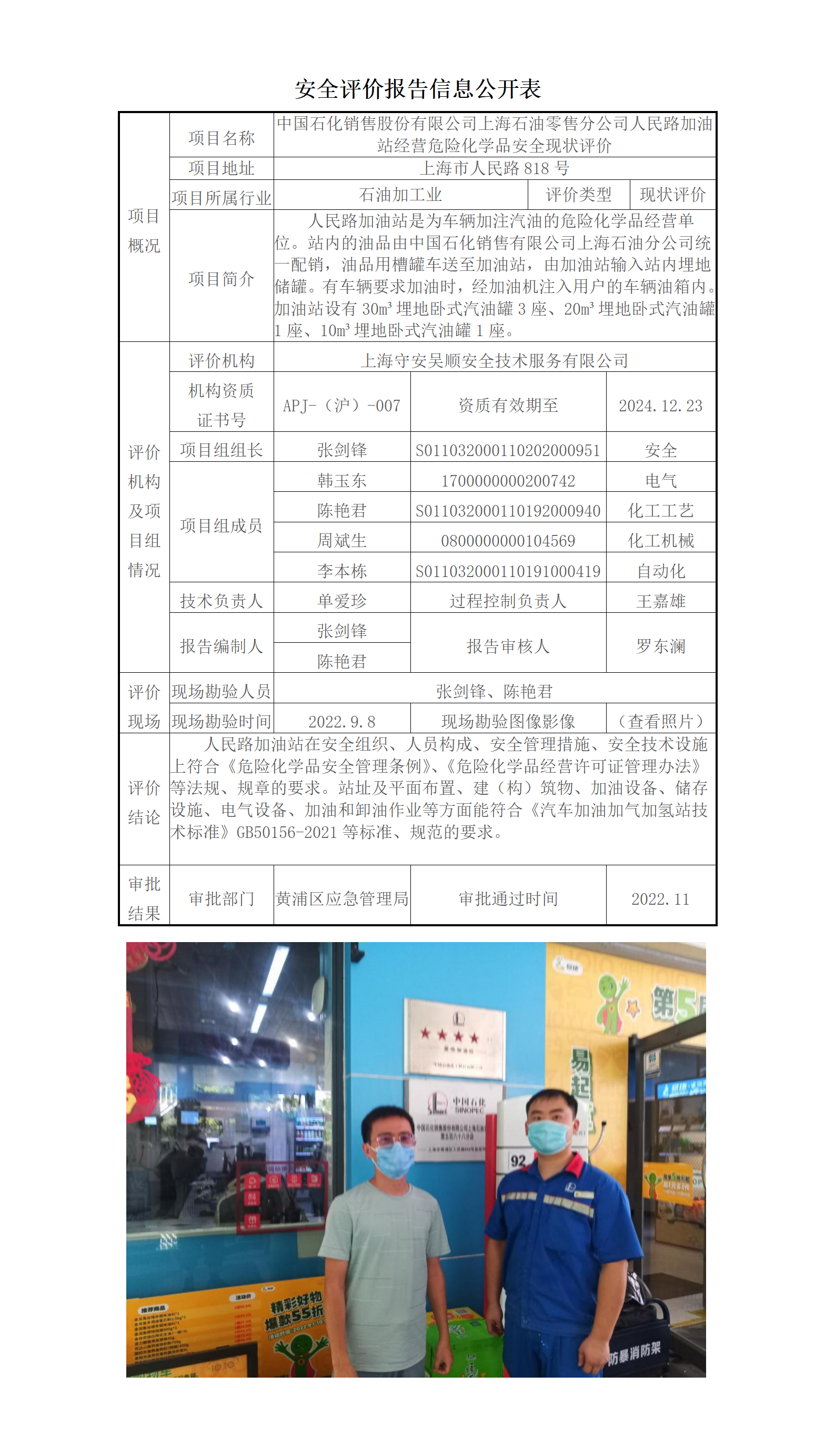 中国石化销售股份有限公司上海石油零售分公司人民路加油站经营危险化学品安全现状评价