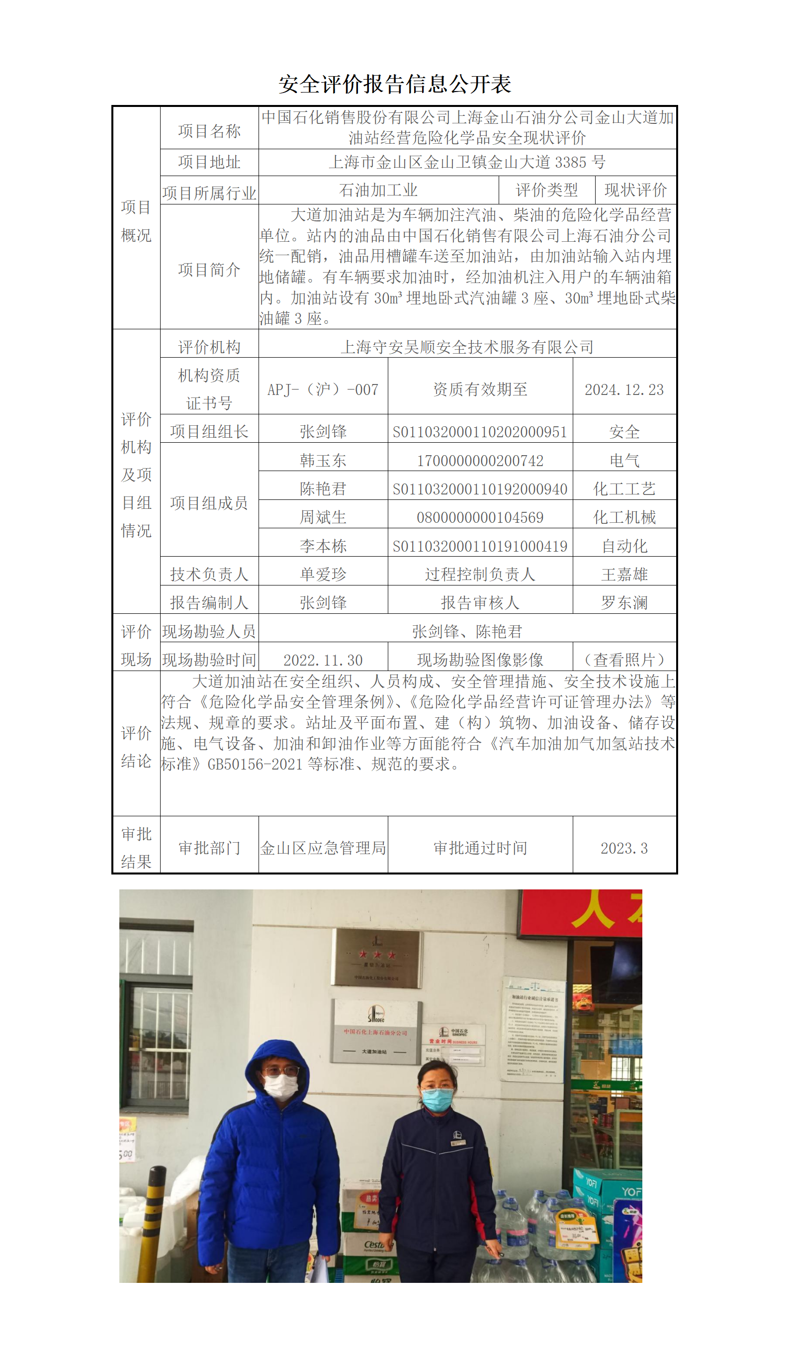 中国石化销售股份有限公司上海金山石油分公司金山大道加油站安全现状评价