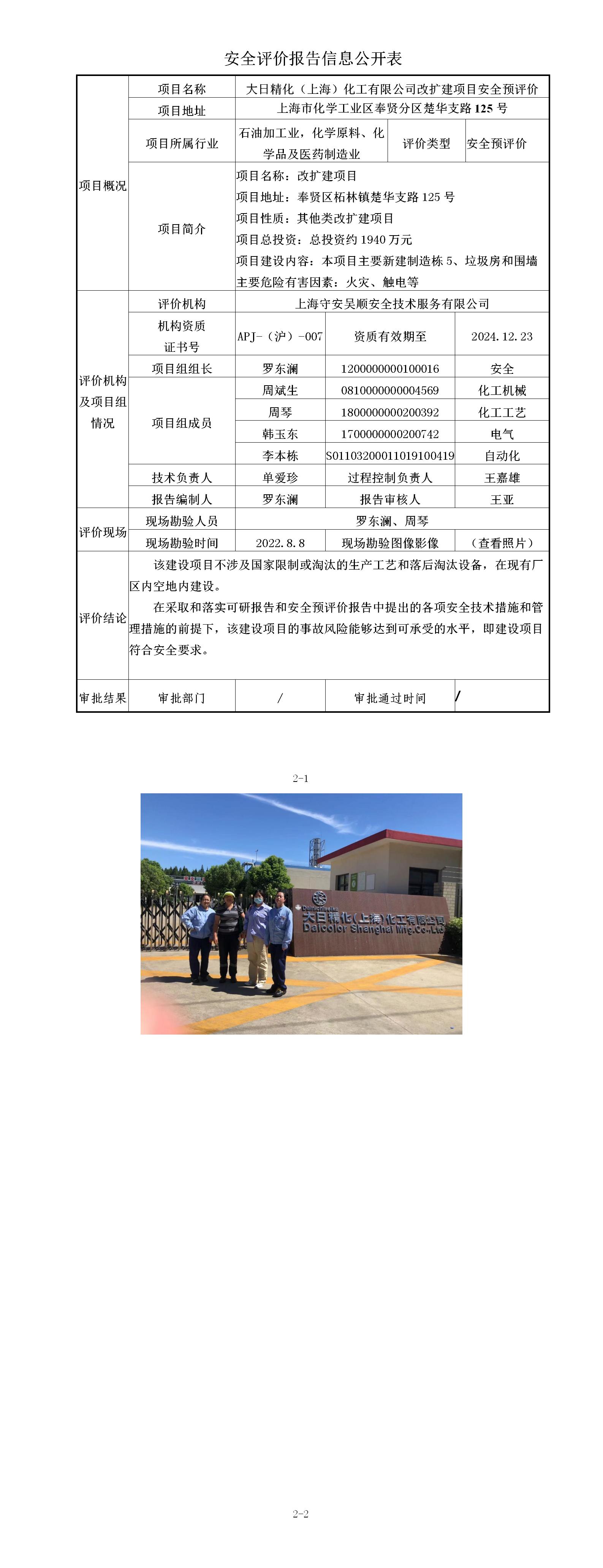 大日精化(上海)化工有限公司改扩建项目安全预评价