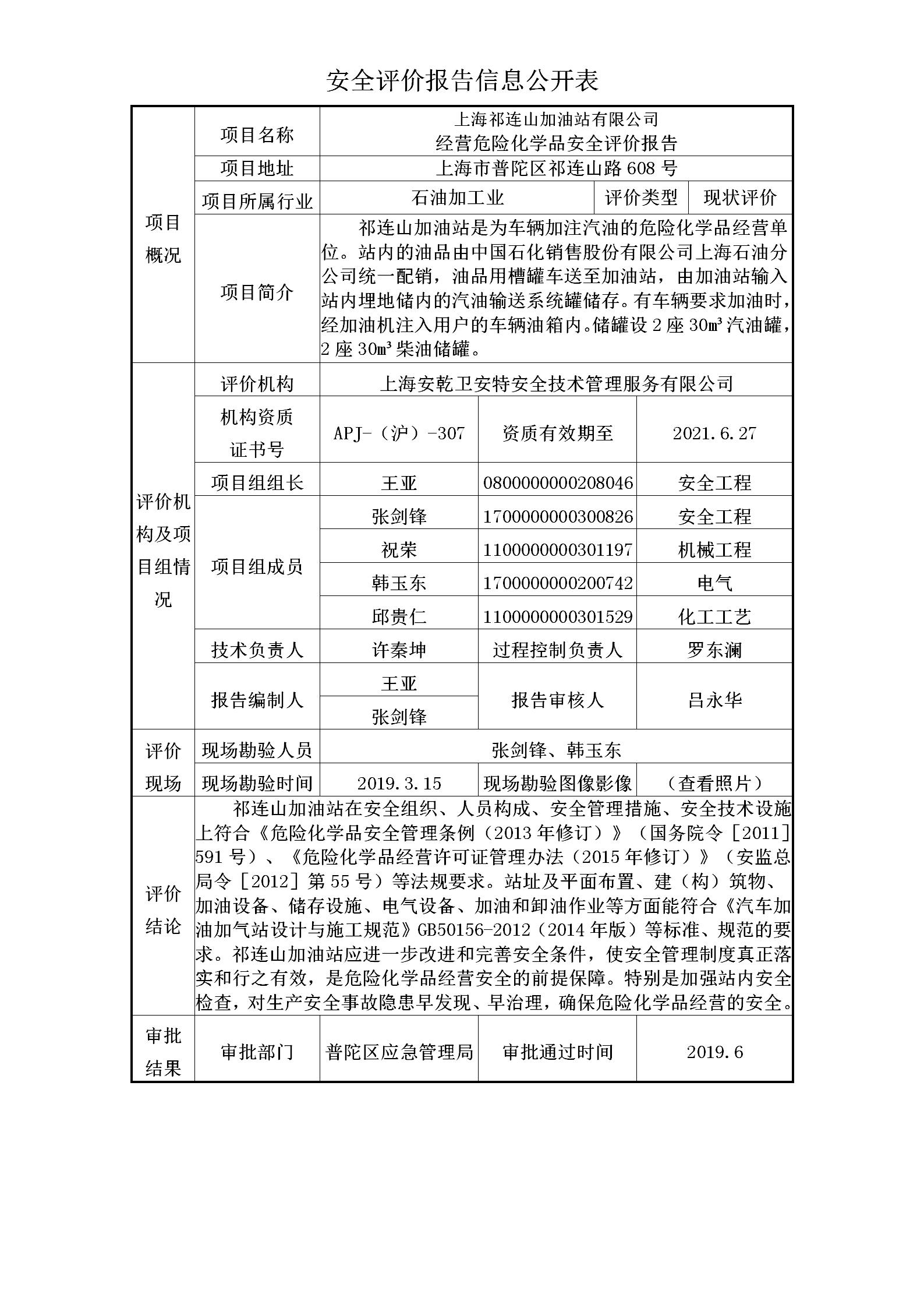 上海祁连山加油站有限公司经营危险化学品安全评价报告