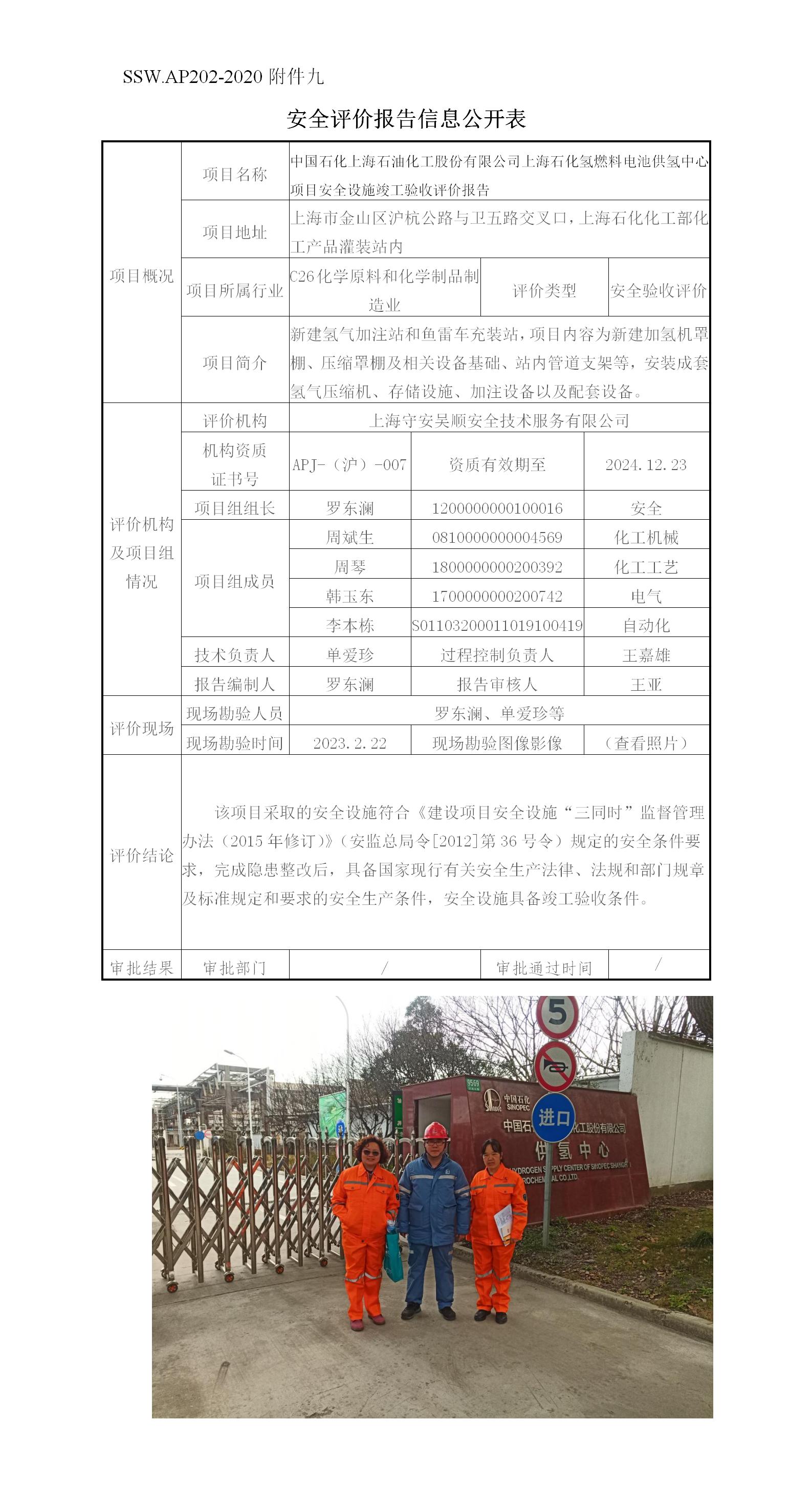 中国石化上海石油化工股份有限公司上海石化氢燃料电池供氢中心项目安全设施竣工验收评价报告