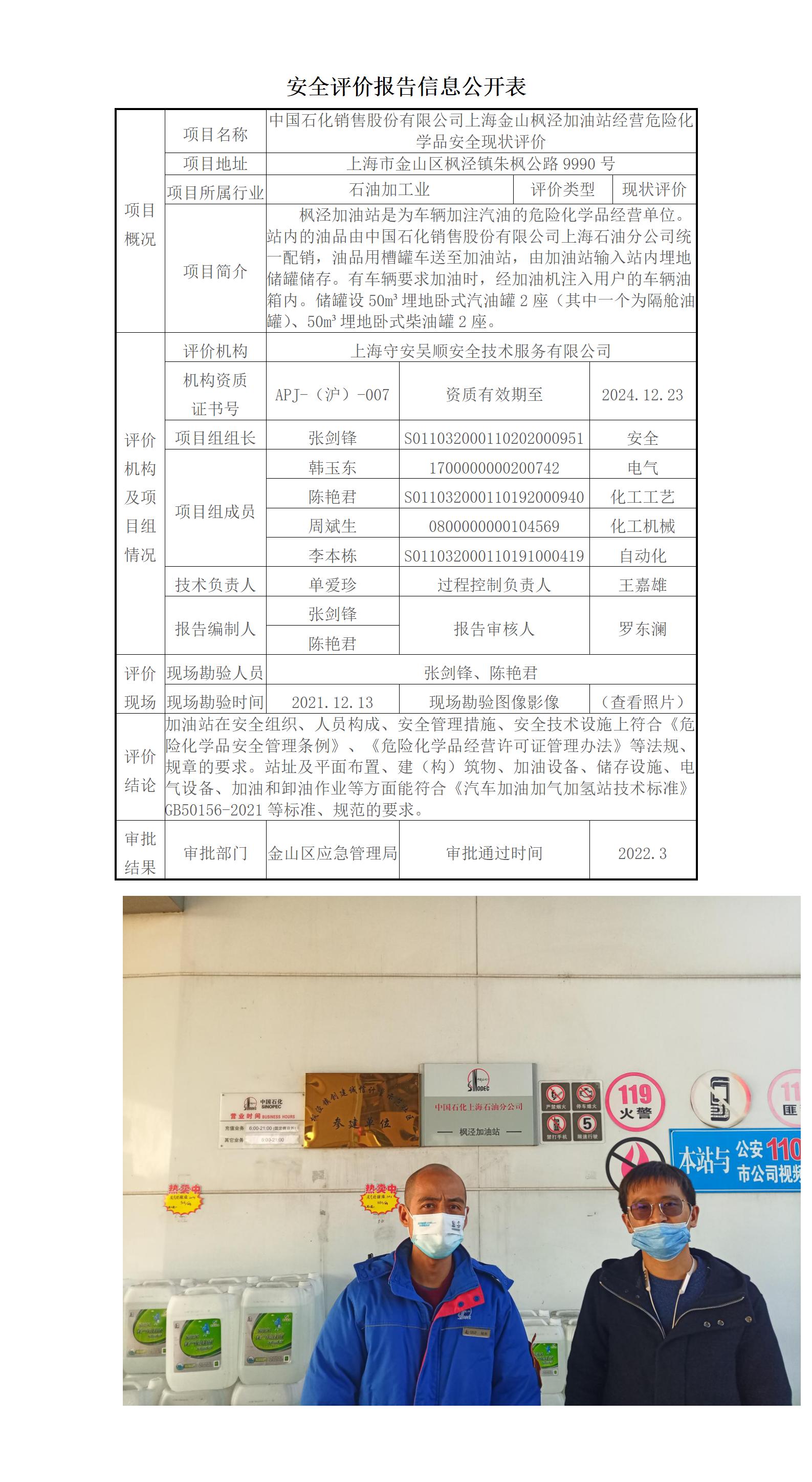 中国石化销售股份有限公司上海金山枫泾加油站经营危险化学品安全现状评价
